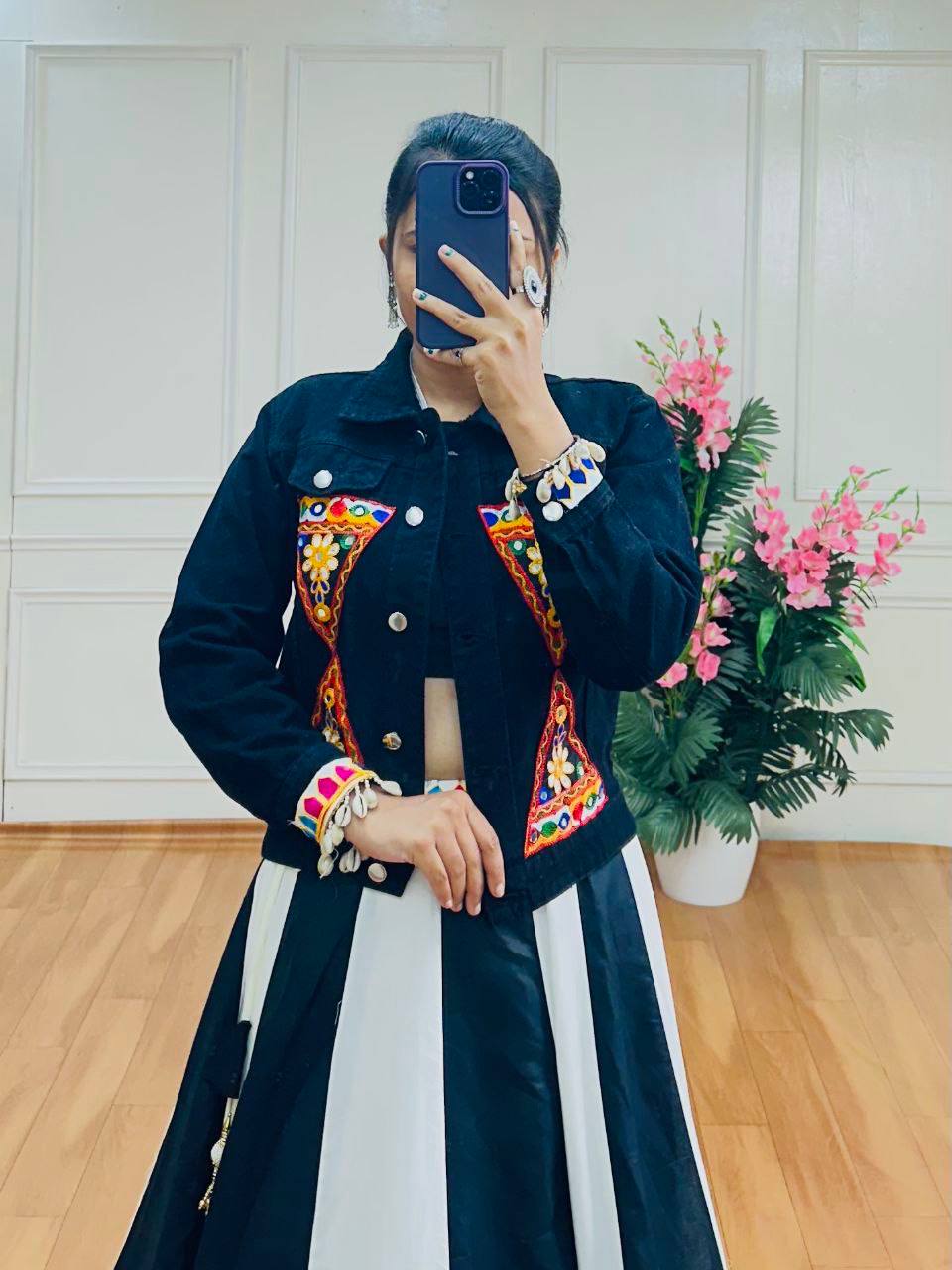 Navy Blue Pure Reyon Silk With Denim Jacket Navratri Lehenga Choli