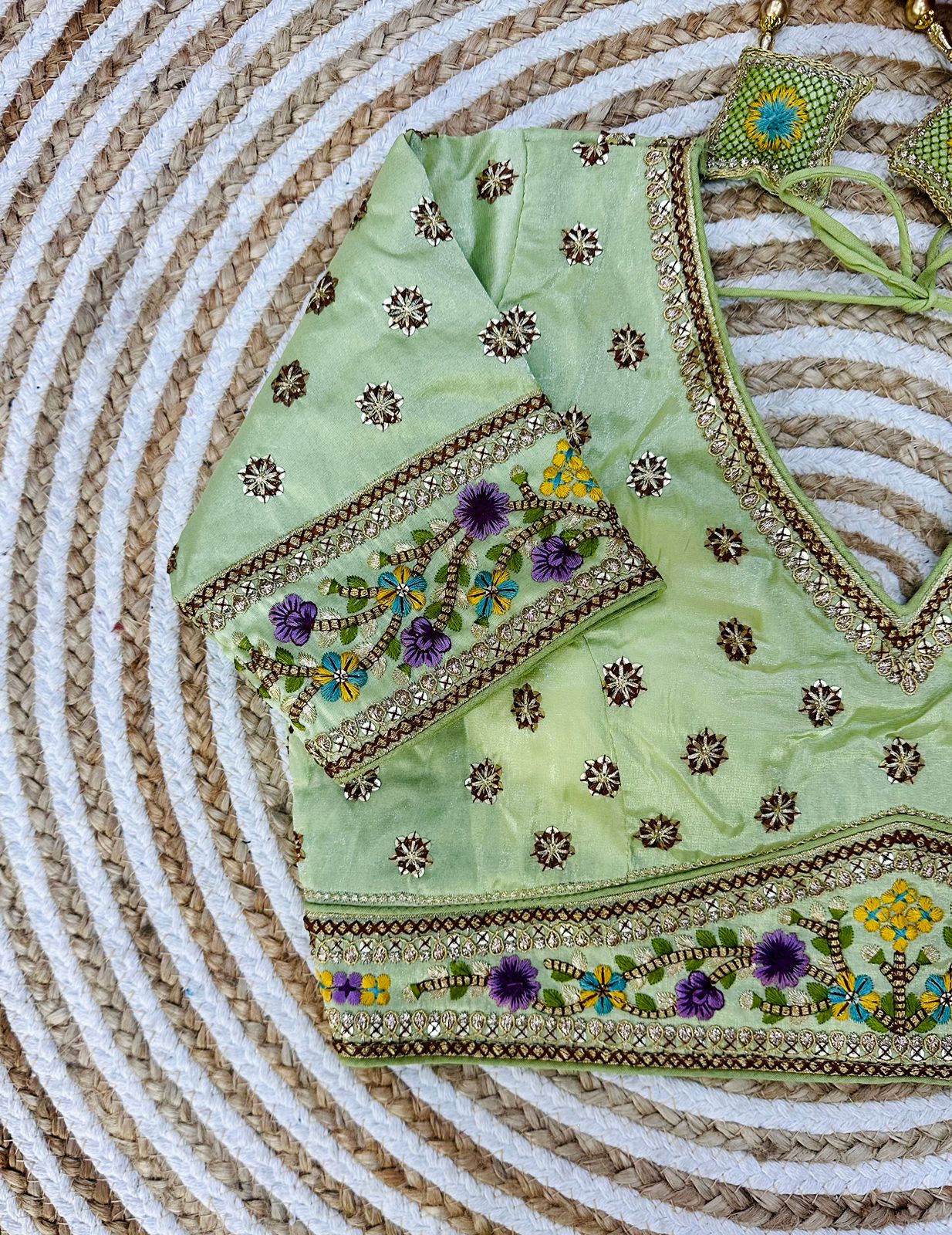 Beautiful coding work with heavy sequence butties all over with multi colour embroidery in border of the blouse