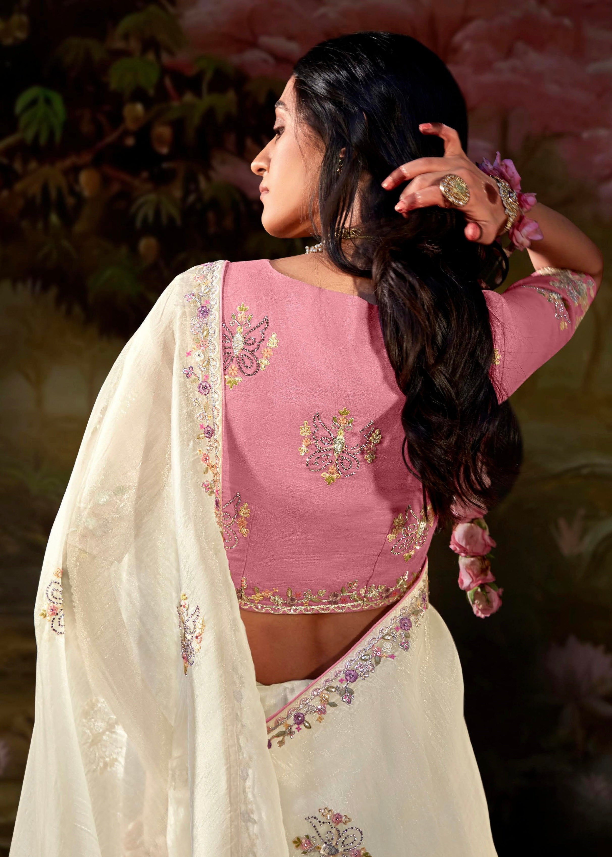 Off-White Glass Tissue Organza Saree with Embroidery & Sequin Work