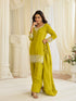 Elevate your festive wardrobe with this striking olive green kurti palazzo set crafted from premium Simar silk. The intricately beaded kurti showcases meticulous embroidery work that catches light beautifully, while the flowing Farsi palazzo offers elegant drape and comfort. Completed with a lace-detailed dupatta, this three-piece ensemble delivers sophisticated style for weddings, celebrations, and special occasions. The rich olive tone pairs effortlessly with traditional jewelry, making it a versatile choice for any festive gathering.