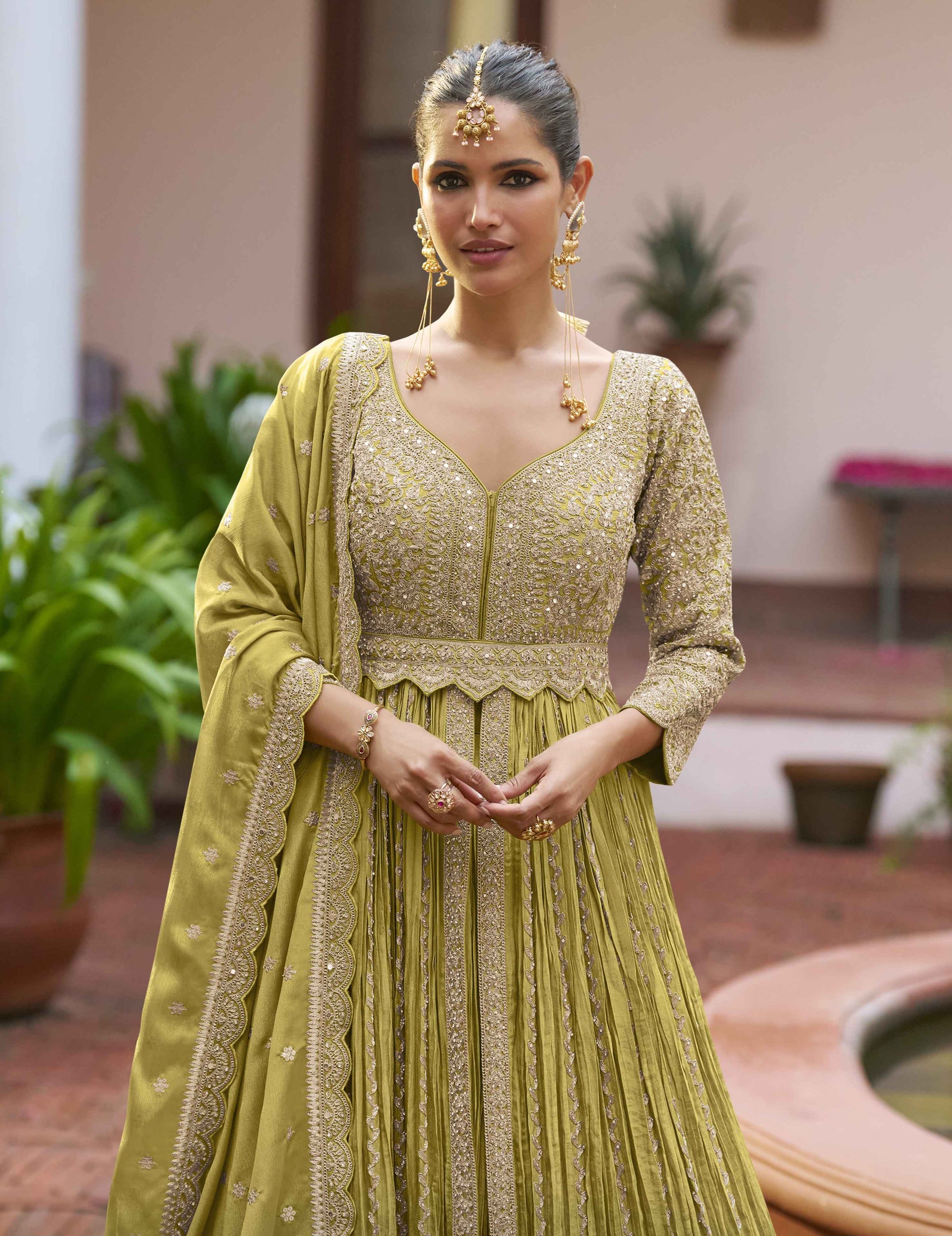Olive Green Heavy Embroidered Chinon Anarkali Gown With Dupatta