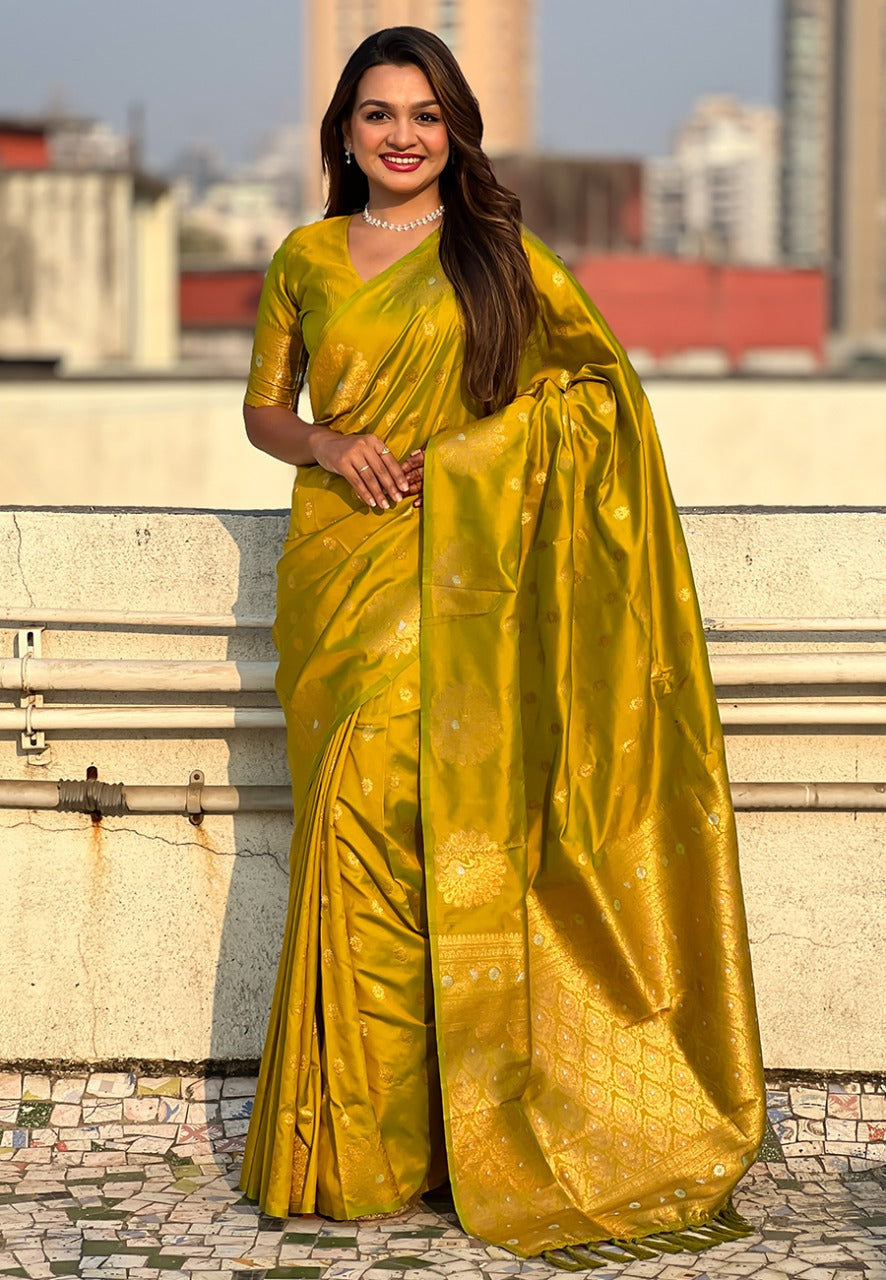 Olive Pure Soft Munga Silk Handloom Weaving Saree