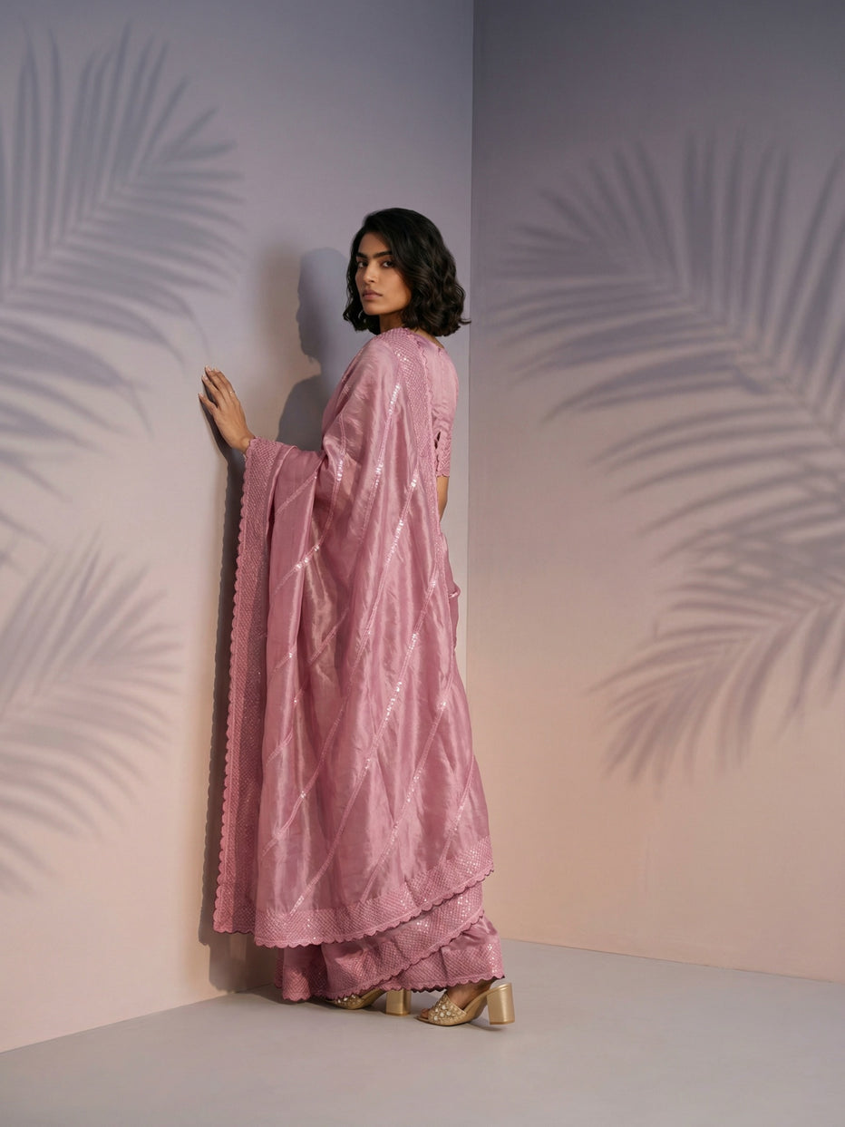 Onion Pink Pure Raspberry Silk Embroidered Leheriya Work and Sequin Saree