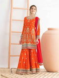 Command attention in this vibrant orange chinnon sharara suit, engineered for maximum festive impact. The ensemble showcases masterful embroidery combined with intricate dabka and sequence work that creates dimensional depth across the fabric. The traditional sharara silhouette drapes with fluid elegance, while the red dual-shade dupatta introduces sophisticated color contrast and visual richness. Expertly tailored for wedding ceremonies, receptions, and significant cultural occasions, this piece delivers the ornamental grandeur expected of premium festive wear. The harmonious interplay of embellishment techniques ensures you remain the focal point at any celebration.