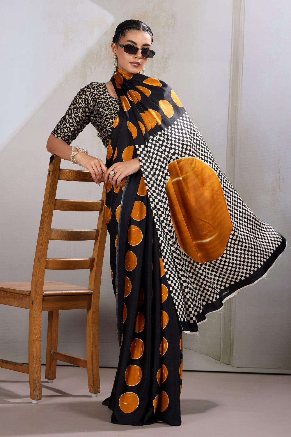 Orange Printed Polka Dots Satin Crepe Saree