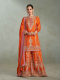 Elevate your festive wardrobe with this orange palazzo suit made from premium Real Chinon fabric. Featuring detailed embroidery and refined handwork, it offers a sophisticated blend of traditional charm and vibrant appeal. Ideal for weddings, sangeet, and special occasions, the set includes a matching Real Chinon dupatta and palazzo pants, ensuring a polished and graceful ensemble.