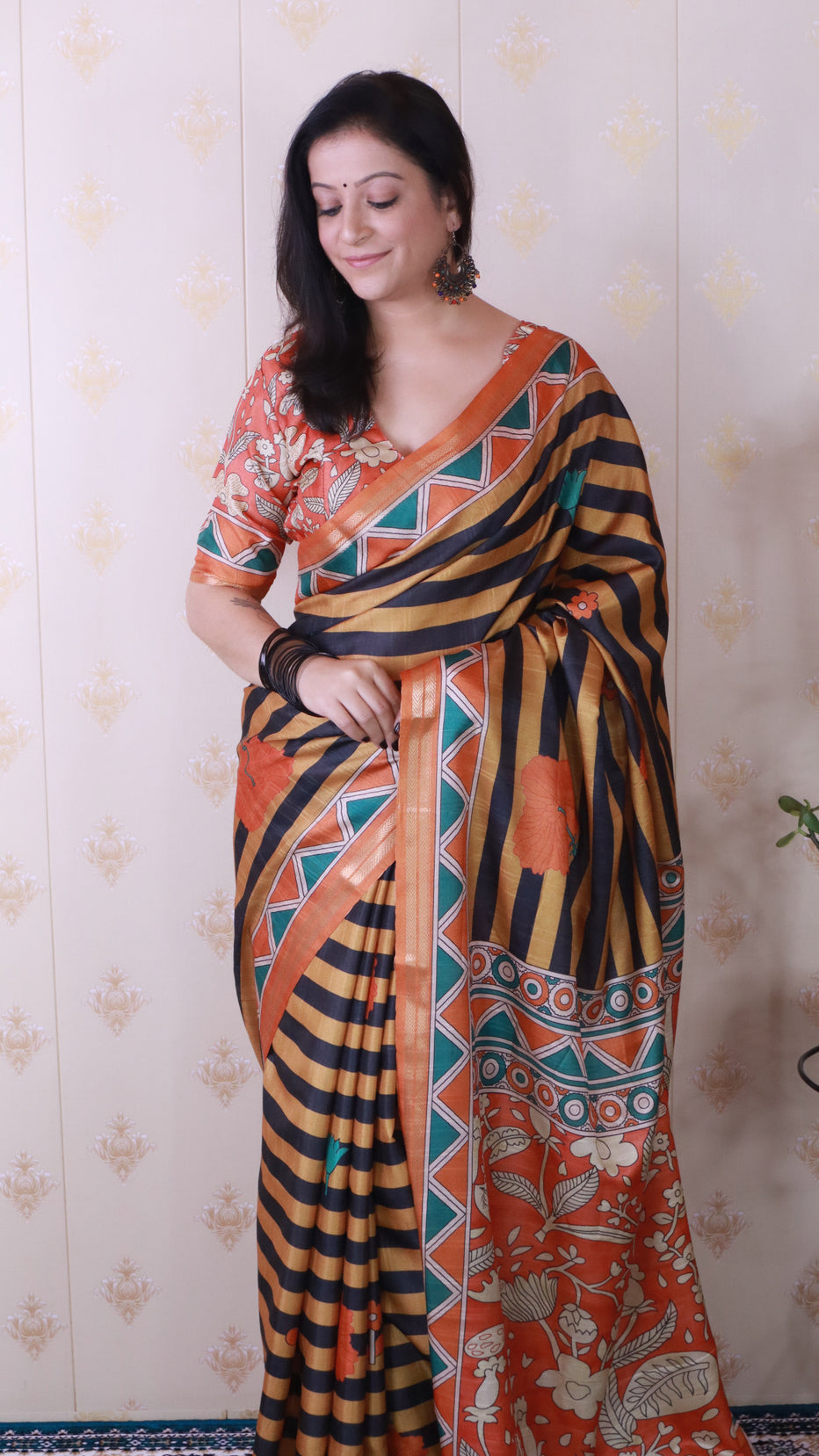 Orange Soft Tussar Silk Striped Traditional Printed Zari Tussar Saree