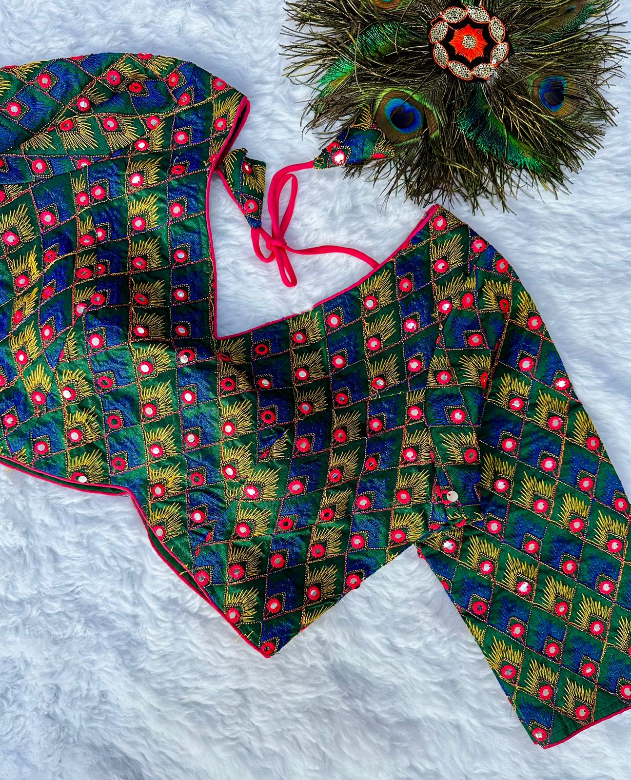 Beautiful golden coading with multi colour thread work attach with foil mirror in blouse
