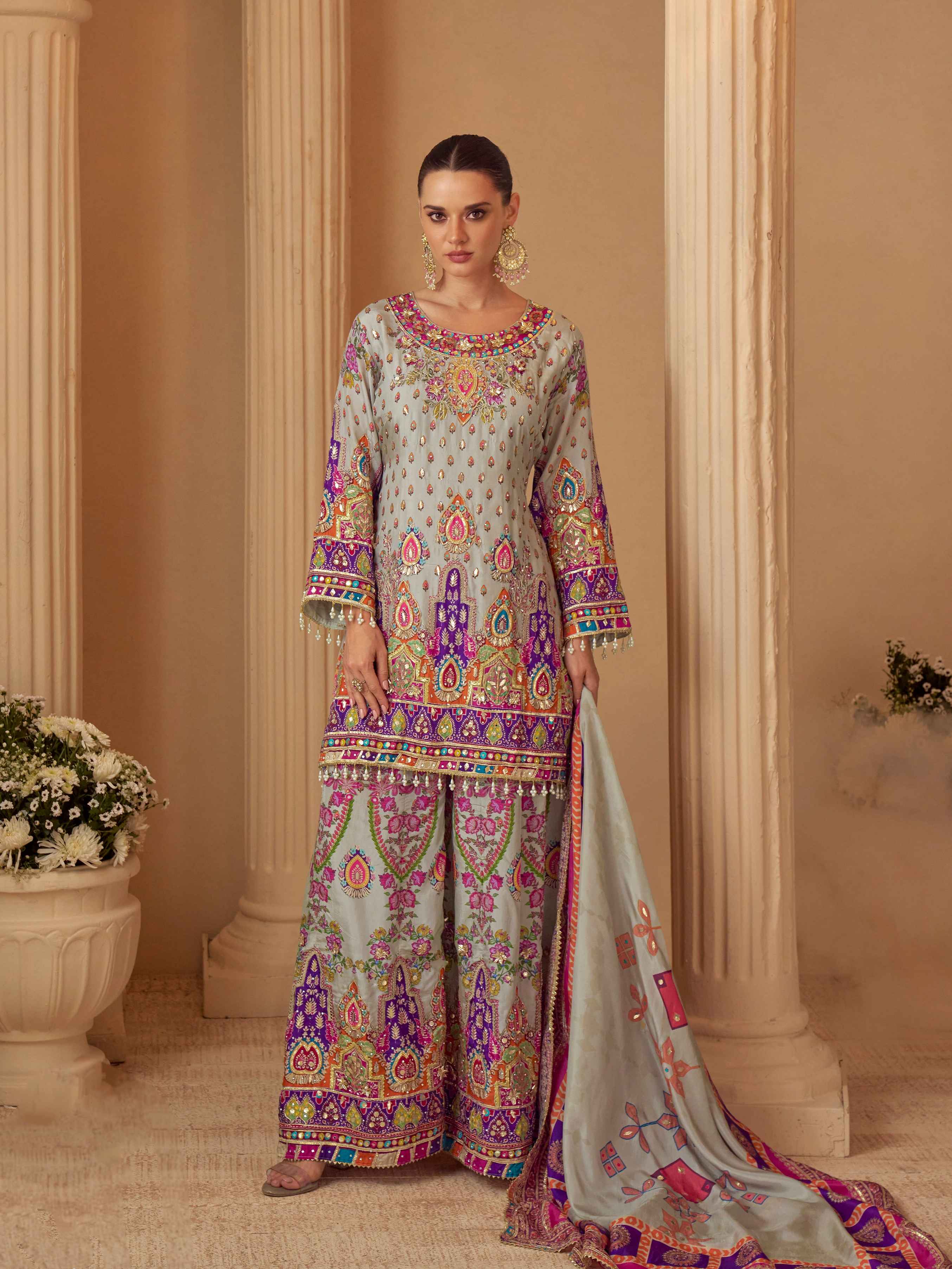 Pastel Grey Natural Silk Printed Plazzo Suit with Gota Tassel Dupatta
