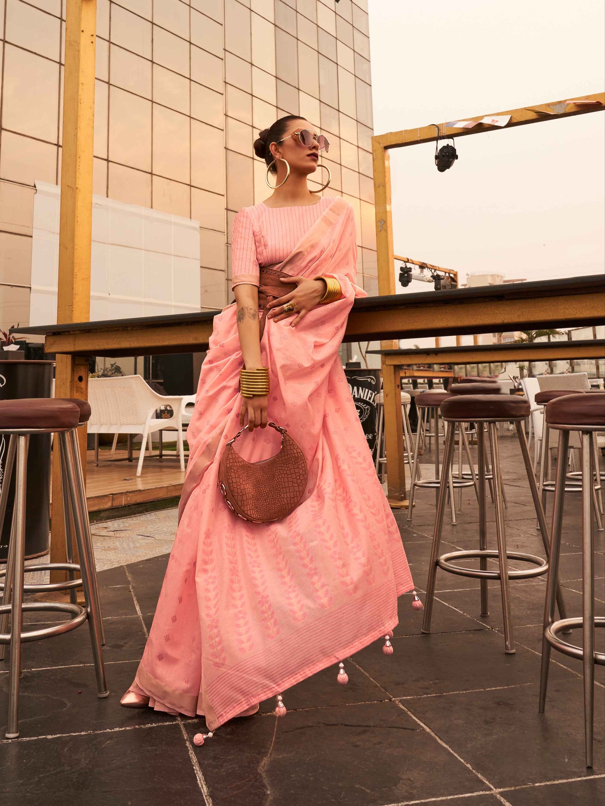 This peach modal poly viscose handloom saree features delicate thread weaving and refined tassel accents, enhancing its subtle elegance. The soft peach tones exude warmth, making it an excellent choice for festive mornings, daytime events, and sophisticated gatherings. Combining luxurious texture with comfort, this saree offers timeless grace for any occasion.