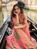 The Peach-Pink Floral Chinon Silk Anarkali Gown features intricate heavy embroidery on the yoke and border, enhanced by delicate floral digital prints. Its flowing silhouette moves gracefully, complemented by a matching embroidered dupatta that elevates the ensemble's sophistication. Ideal for wedding receptions, parties, and festive events, this gown combines refined craftsmanship with effortless elegance for standout style.