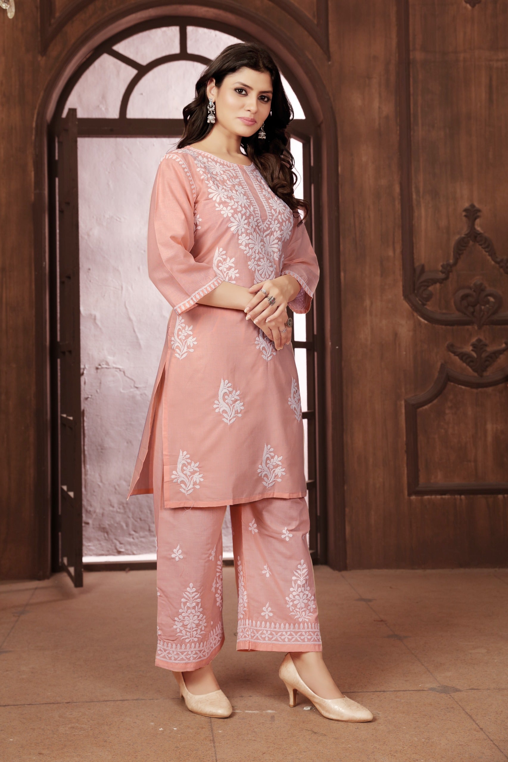Peach Pure Heavy Cotton with Chikankari Embroidery Work Plazo Suit