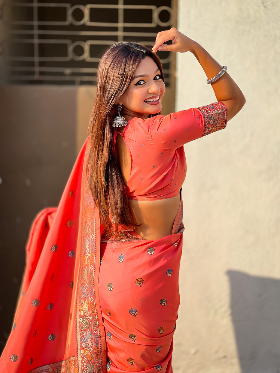 Peach Pure Soft Baluchari Silk Zari Meenakari Saree