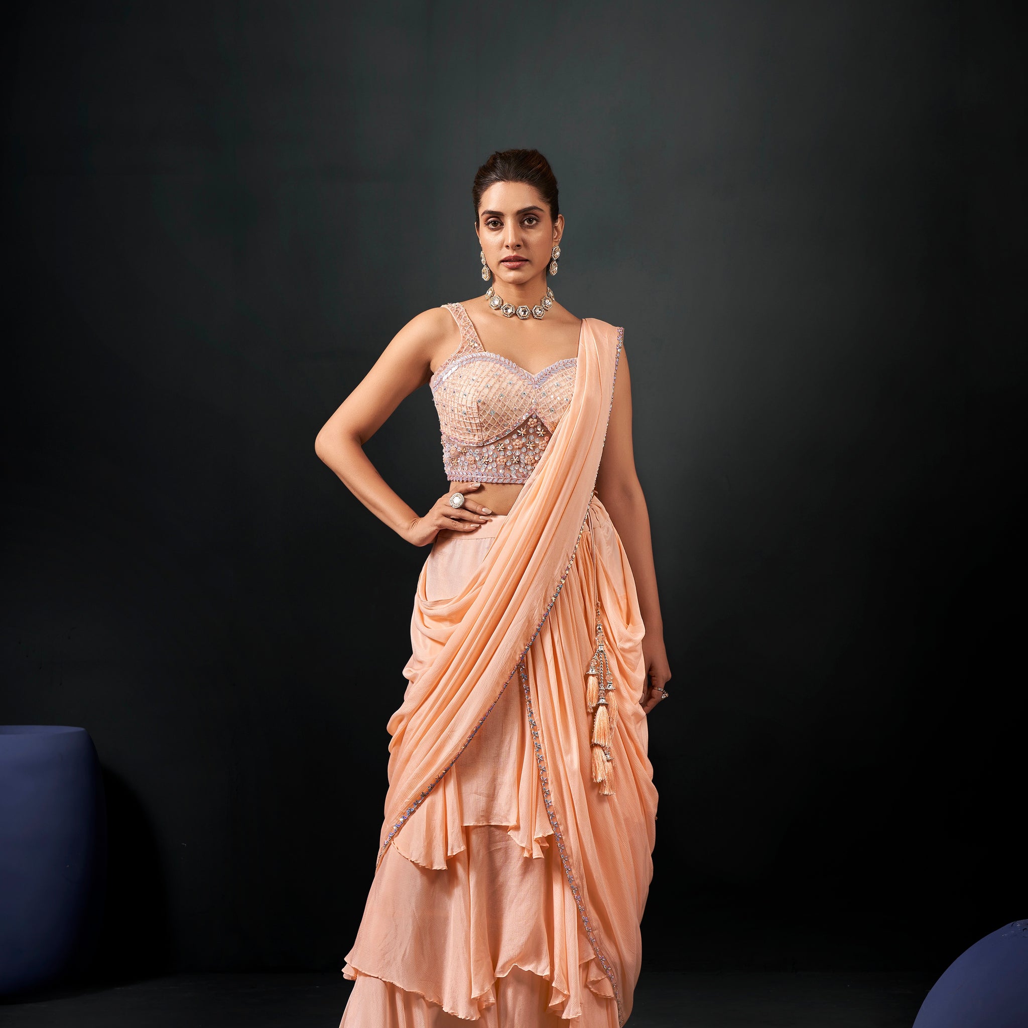 Peach Ready-to-Wear Georgette Chiffon Saree & Hand Embroidered Blouse