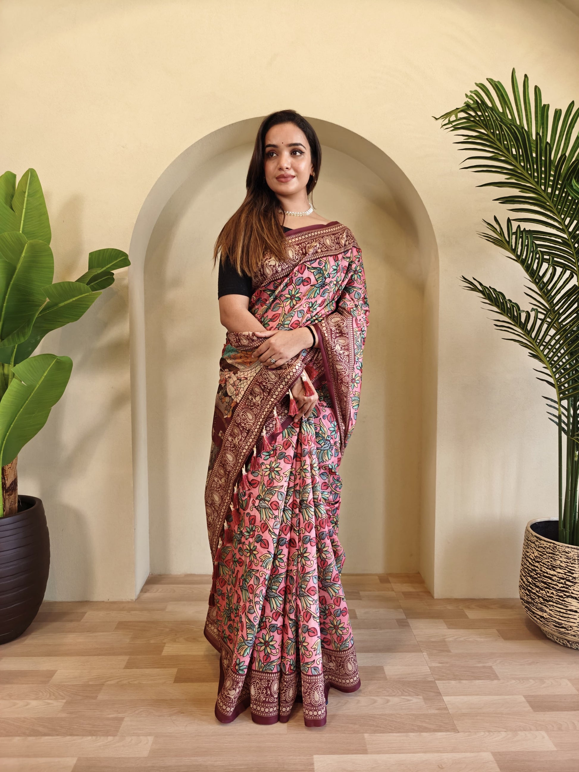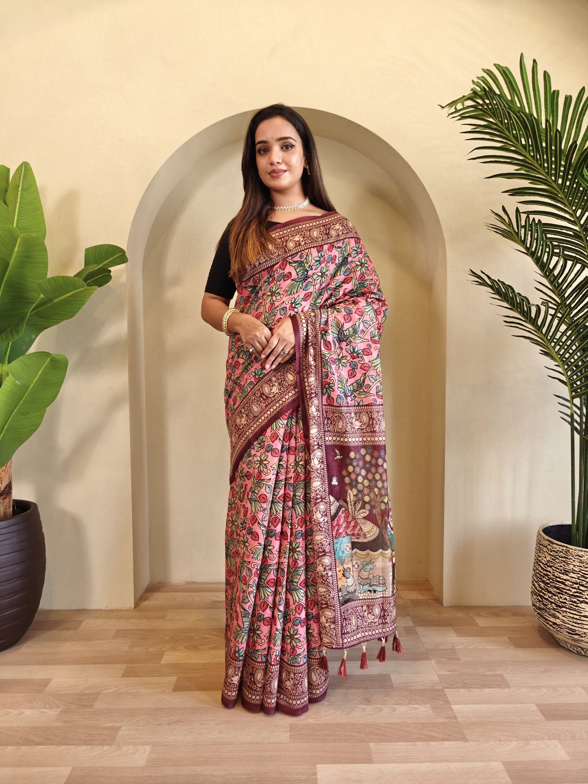 Description - soft cotton chanderi sarees with kalamkari digital print pattern tassels over the saree.