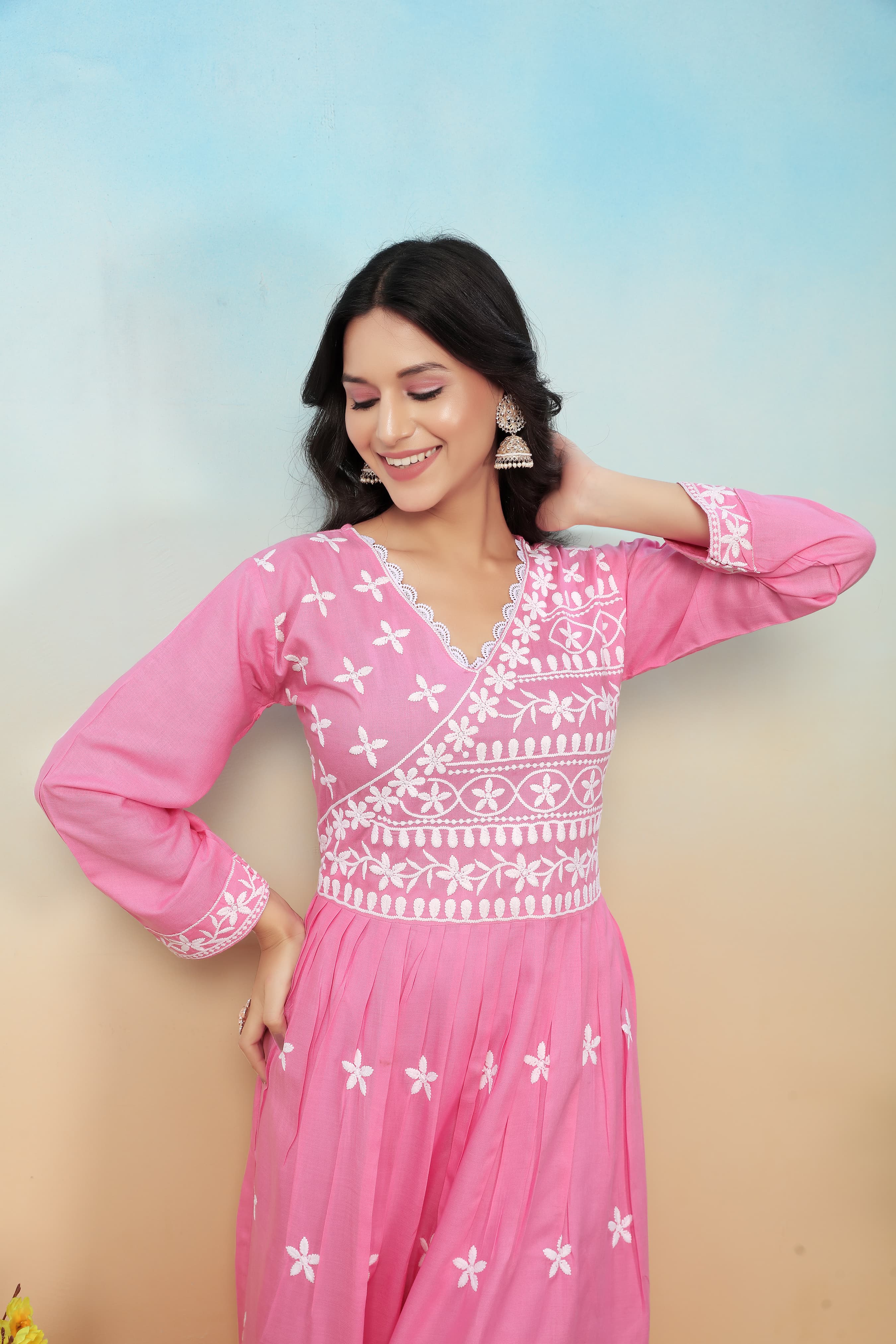 Pink Pure Heavy Cotton with Long Chikankari Embroidery Work Plazo Suit
