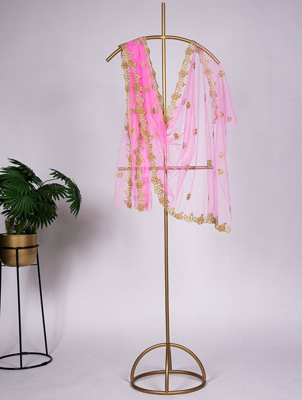 Pink Pure Soft Net Embroidery Cut Work and Stone Work Net Duppata
