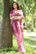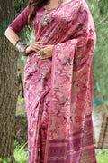 Soft desi Tussar silk saree with unique hand type printed pattern with tiny zari weaving border and printed pallu with traditional tassels and running blouse piece