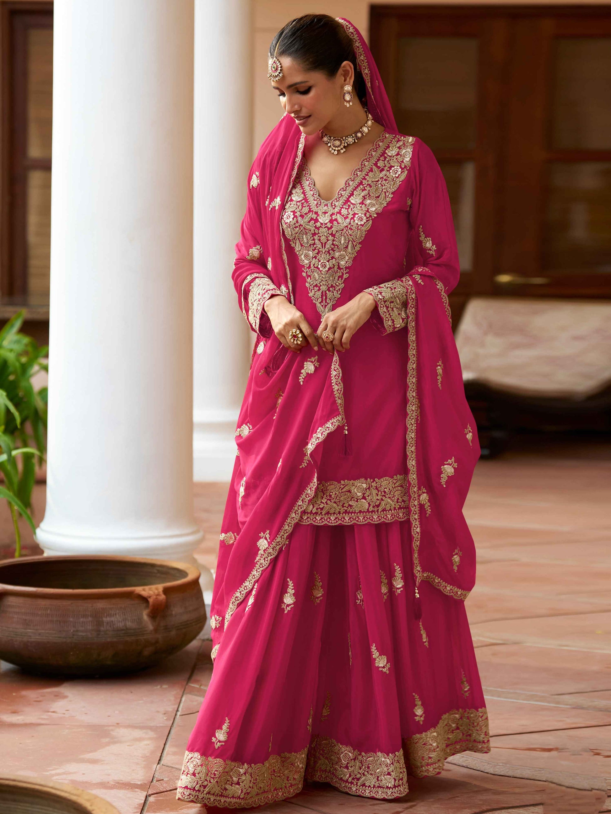 Elevate your festive wardrobe with this Pink Real Chinon Heavy Embroidered Sharara Suit, a masterpiece of traditional craftsmanship. Crafted from premium Real Chinon fabric, this ensemble showcases intricate embroidery and meticulous handwork that exude sophistication. The thoughtfully designed silhouette flatters your frame while radiating wedding-season elegance. Paired with a matching dupatta that drapes with effortless grace, this suit is your ideal choice for mehndi ceremonies, sangeet nights, wedding receptions, and milestone celebrations. A timeless investment in refined style.