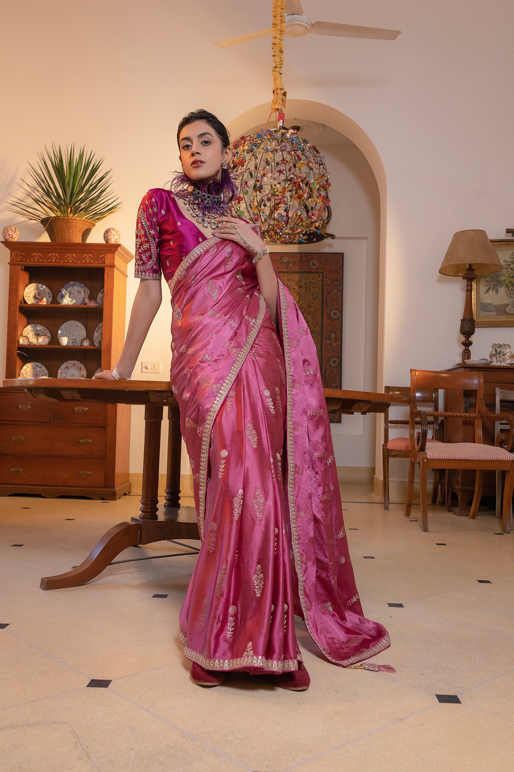 Pink Viscose Satin Silk Saree with Zari Motifs and Sequin Embroidery