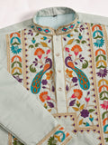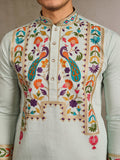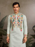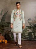 The Pista Green Embroidered Kurta for Men combines luxury and tradition with its viscose silk fabric and detailed multicolored sequin embroidery. Designed for festive occasions like Navratri garba nights and weddings, it ensures both a comfortable fit and a refined appearance. This kurta seamlessly blends softness with sophisticated style, making it an excellent choice for cultural celebrations.