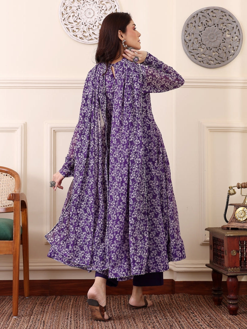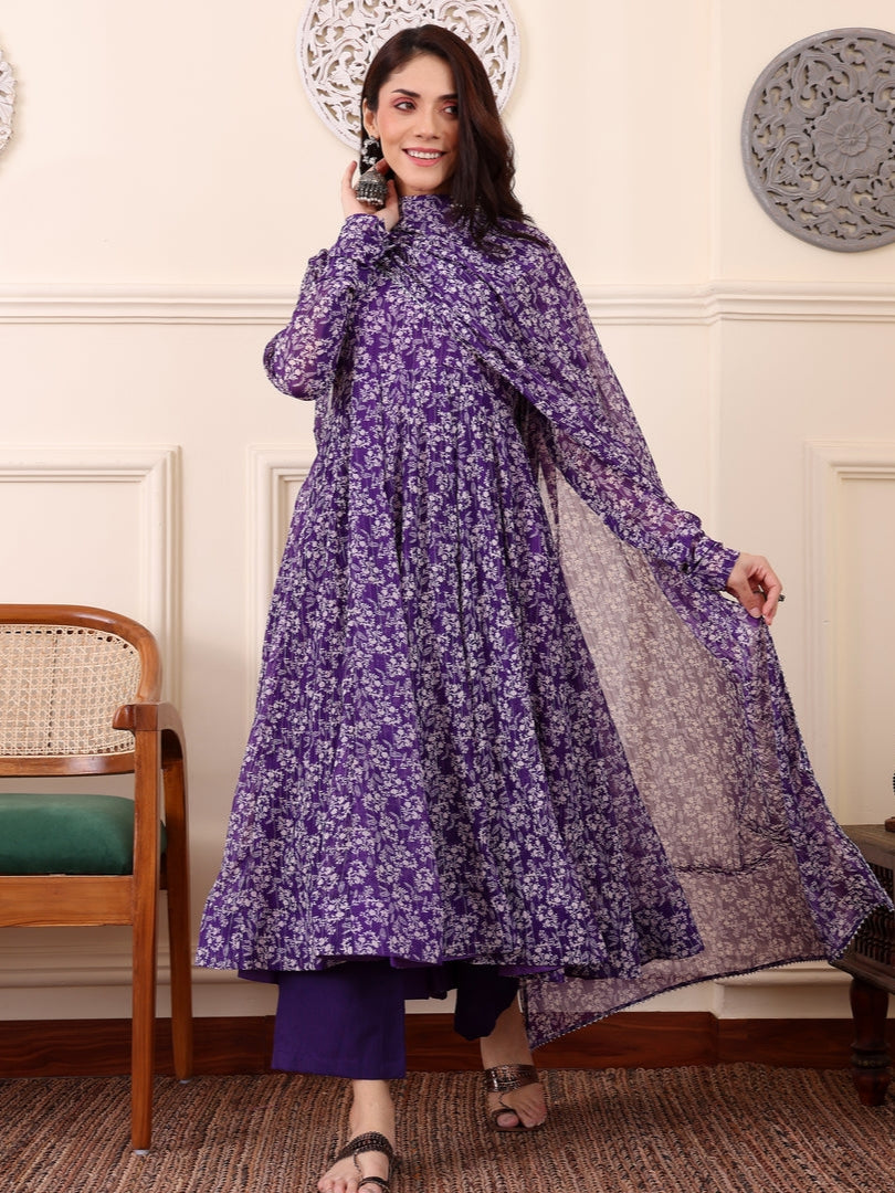 Purple Digital Printed Anarkali Kurti with Dupatta & Bottom