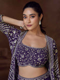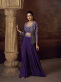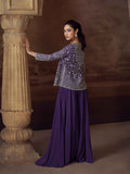 Purple Embroidered Jacket Palazzo Set Elevate your festive wardrobe with this regal Royal Purple Palazzo Suit, expertly tailored from premium Chinon Silk for a luxuriously fluid silhouette. The meticulously embroidered blouse and jacket showcase refined thread work complemented by shimmering mirror embellishments, creating an unmistakably opulent aesthetic. The generously proportioned palazzo pants allow graceful movement and comfort, while maintaining the sophisticated drape essential for formal occasions. Designed specifically for receptions, evening galas, and prestigious festive celebrations, this ensemble delivers the refined elegance and grandeur expected at your most memorable events.