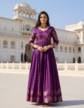Bring out a glorious traditional gown with a mordern silhoutte with boat neck and banarasi zari weaving sleeves,back comes with a decent keyhole shape and flare come with a classic knife pleats
