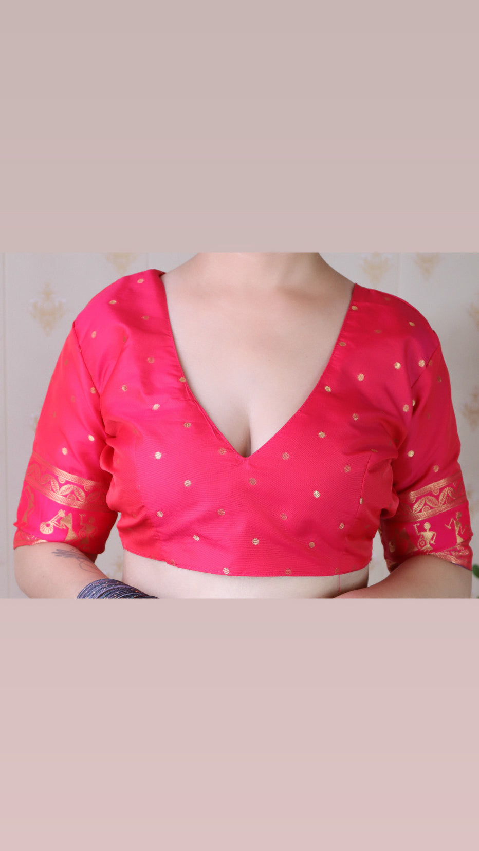 Silk Saree with gold zari small warli art motifs all over the body having contrast rich woven Traditional Warli Art Pallu, traditional border and paired with Contrast brocade Blouse same as shown.