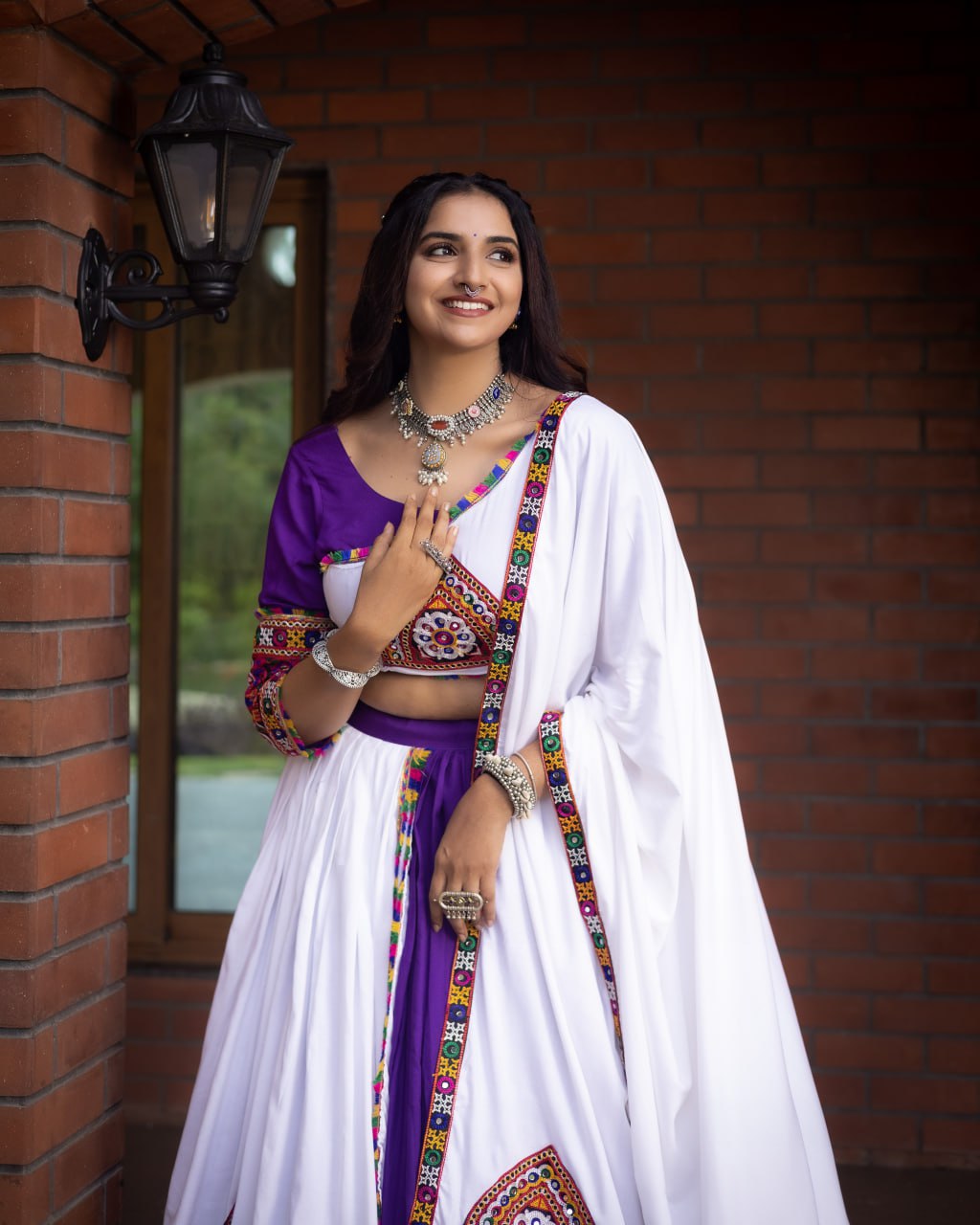 Purple White Pure Reyon Cotton Gamthi Work Navratri Chaniya Choli