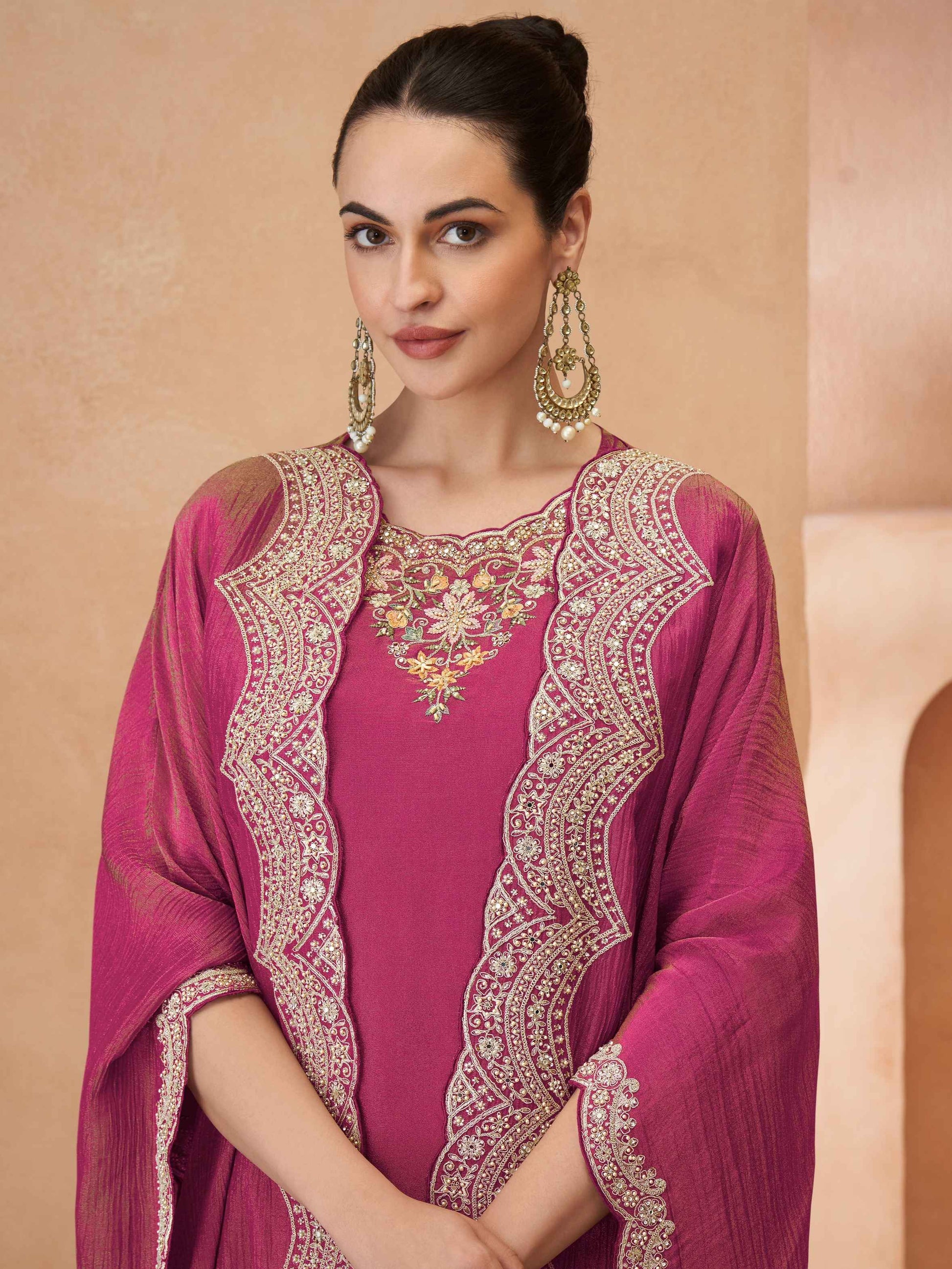 Rani Pink Embroidered Simar Silk Palazzo Suit with Jacket Dupatta