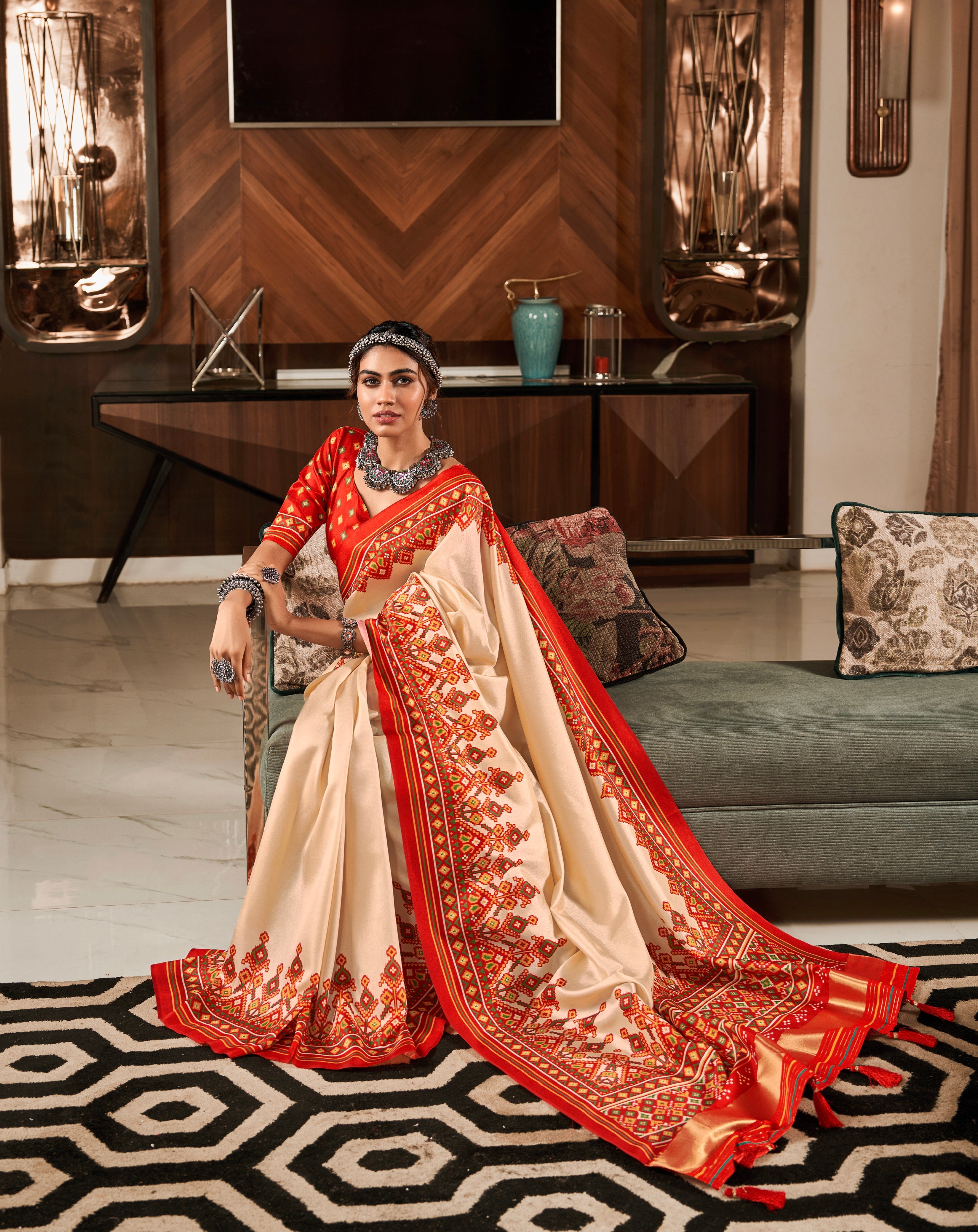 Red and Cream Pure Tusser Patola Saree with Lagadi Patta Pallu