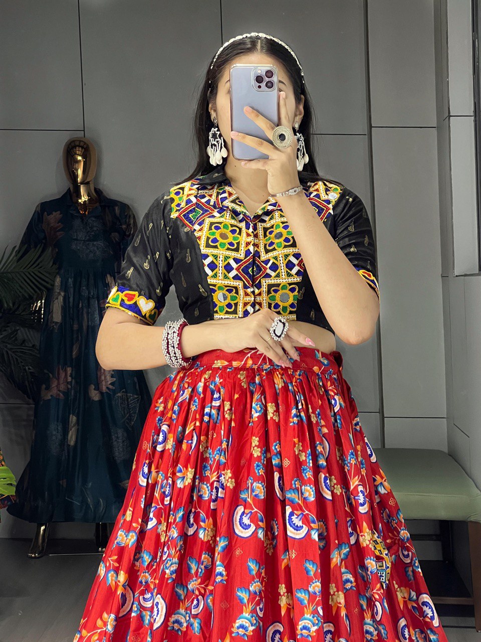 Red Black Pure Soft Silk Floral Print Navratri Chaniya Choli
