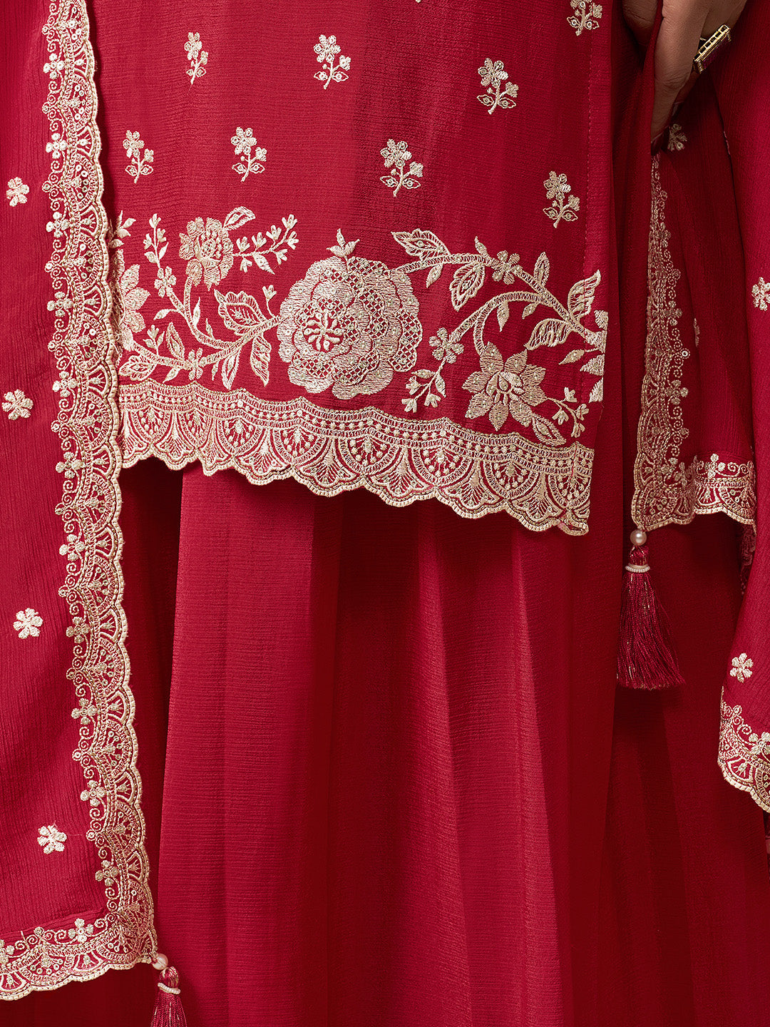 Red Embroidered Chinon Sharara Suit with Thread & Khatli Handwork