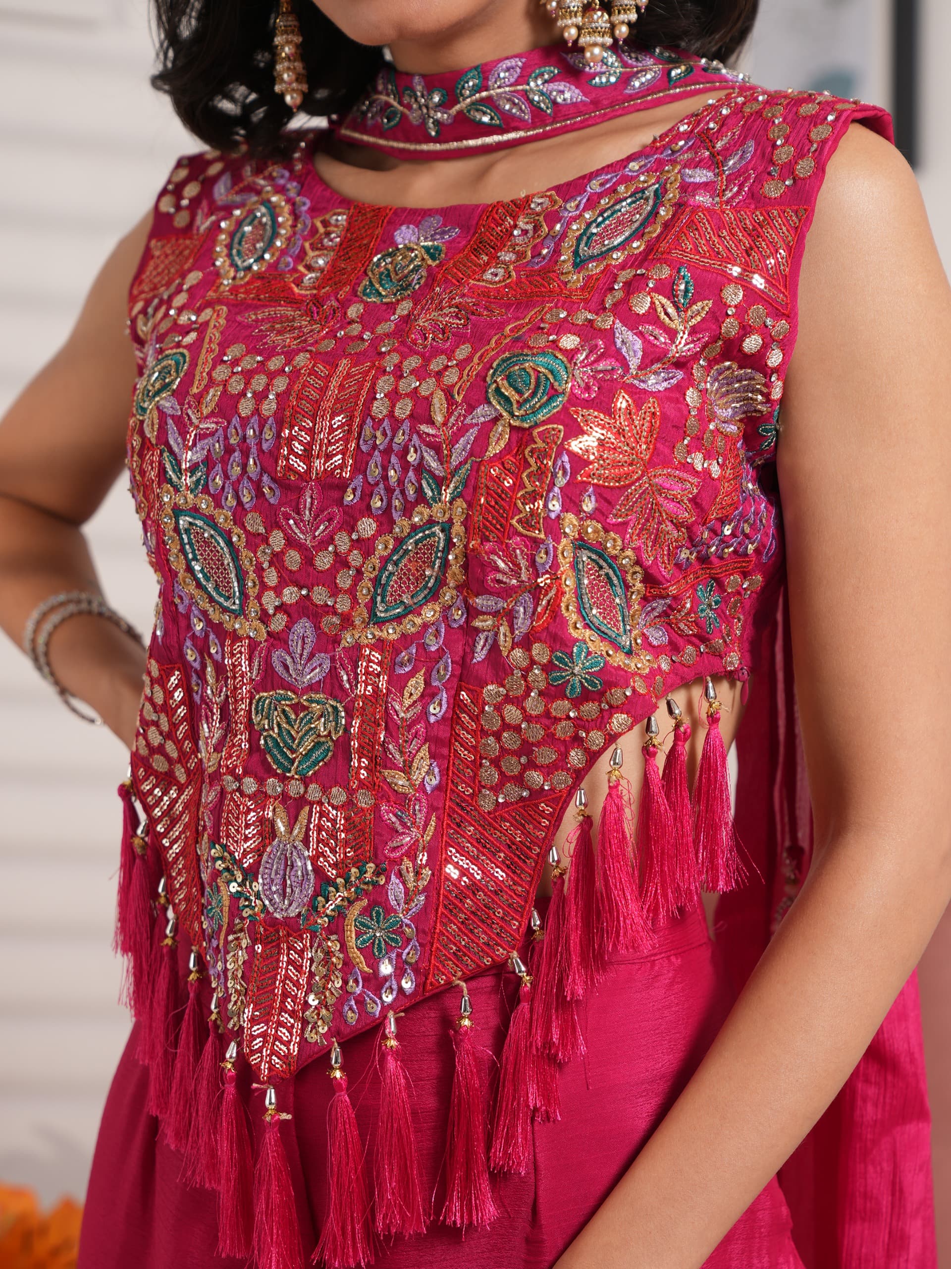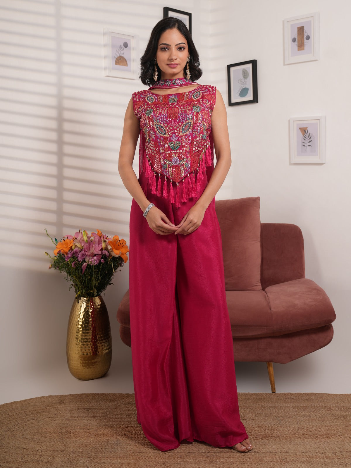 Red Pure Chinon Crop Top With Floral Printed & Embroidered Readymade Dress