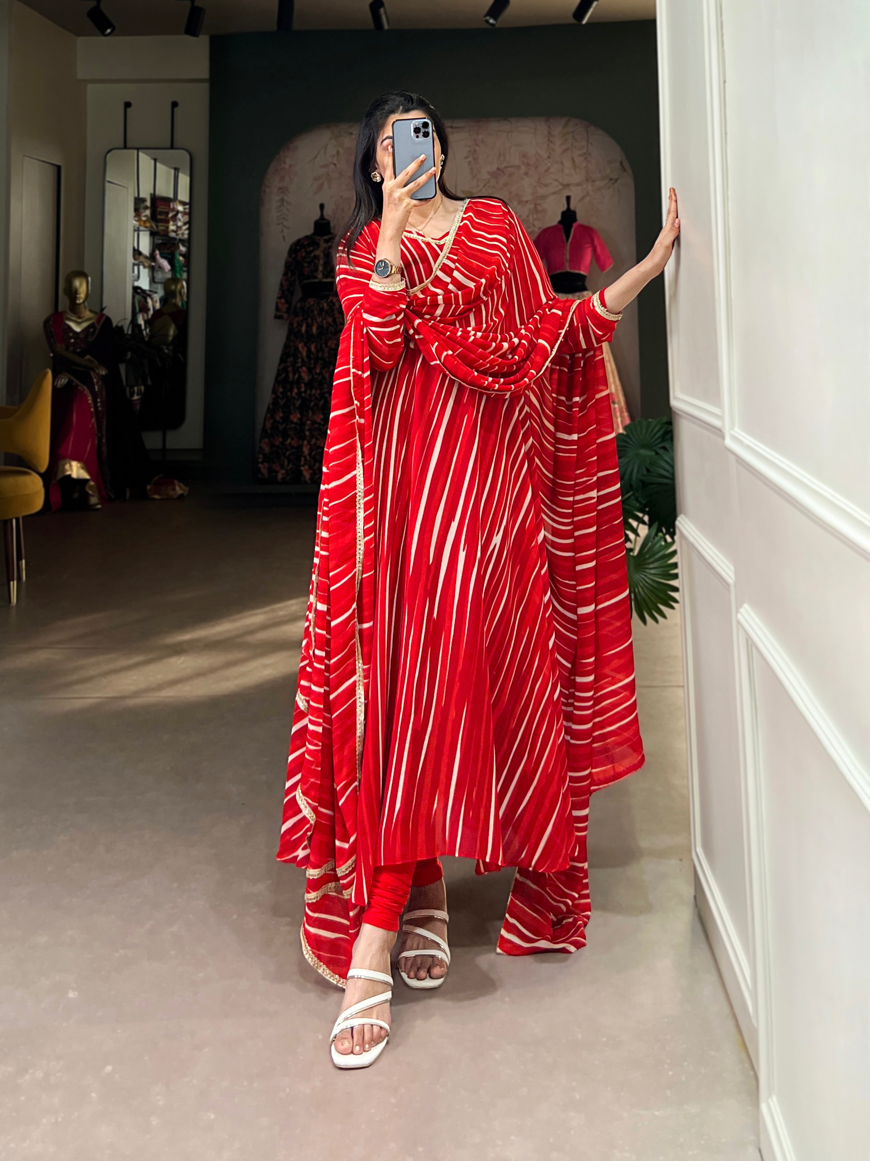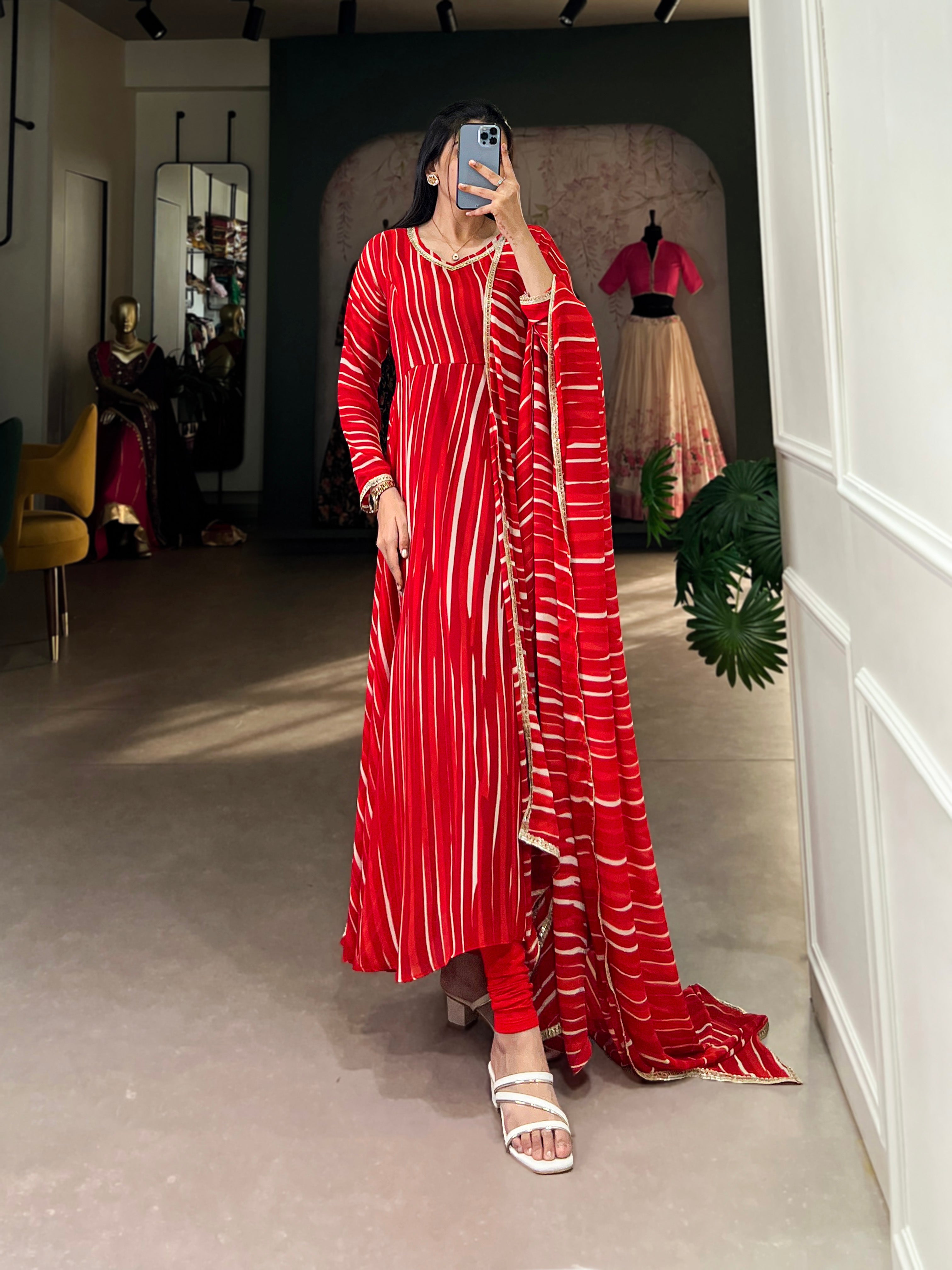 Red Pure Georgette Leheriya Georgette Readymade Anarkali Kurti Set