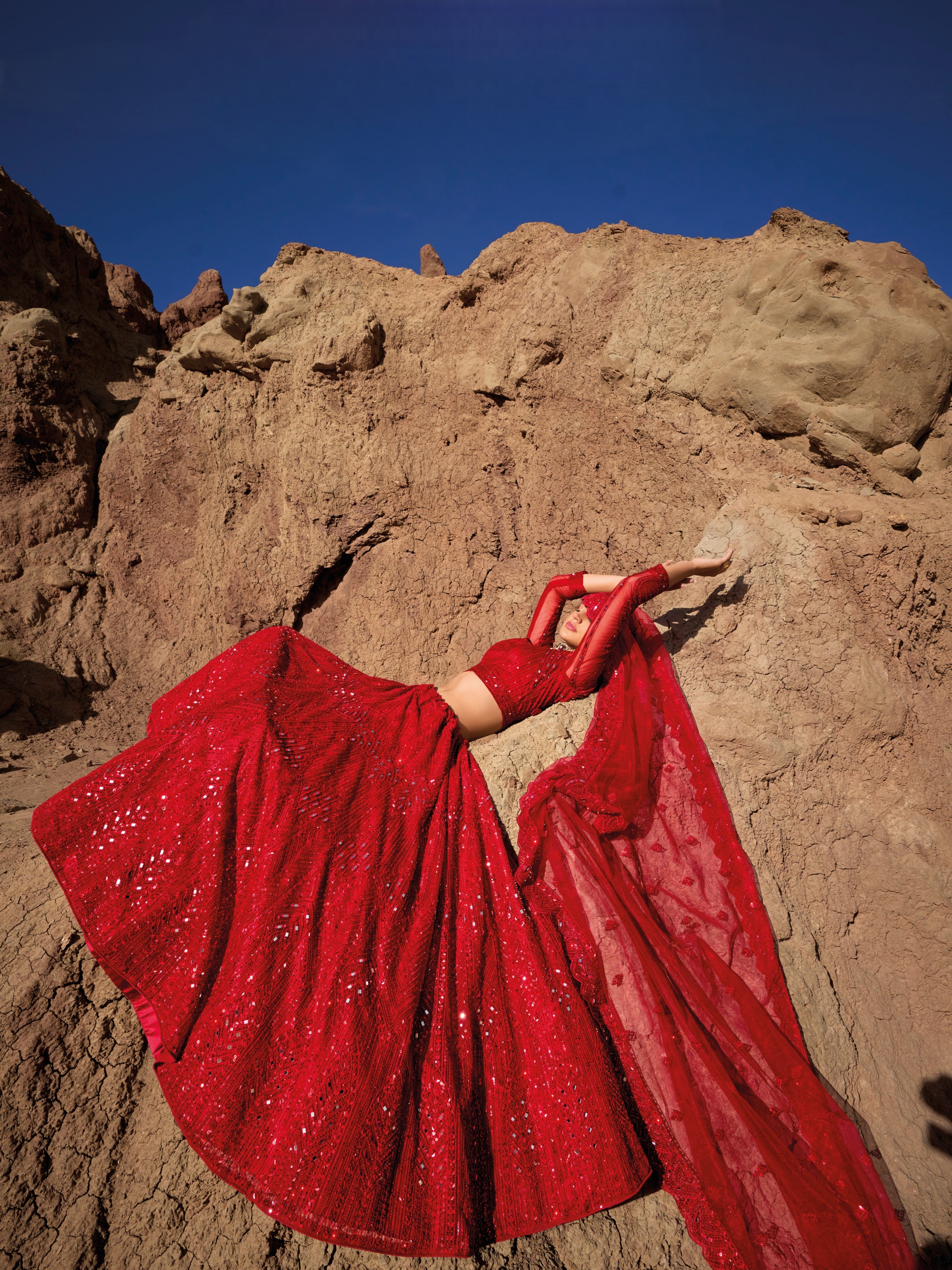 Red Pure Net Lehenga Choli with Heavy Mirror Work & Zarkan Embroidery