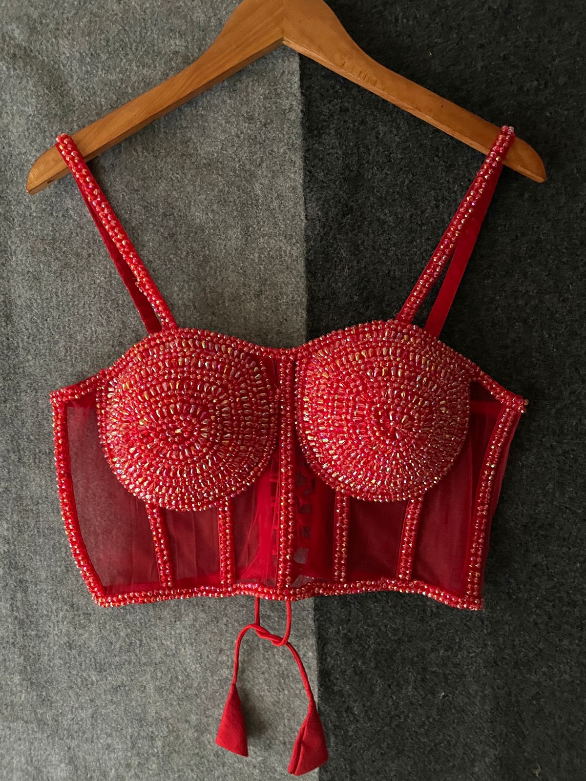 Red Pure Silk Pearl Moti Spaghetti Handcuffed Sleeves Less Blouse