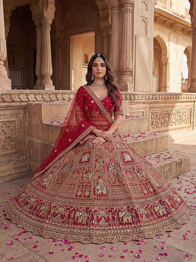 Red Pure Soft Gadwal Silk Heavy Embroidery Work Bridal Lehenga