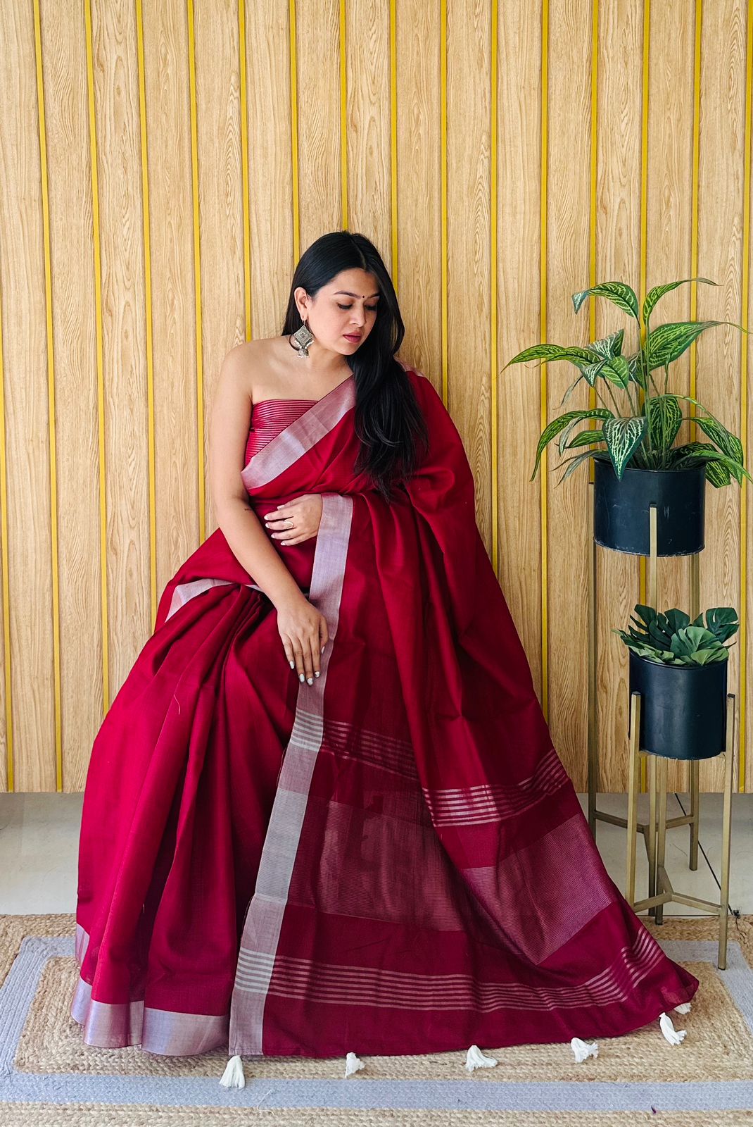 Red Soft Linen Cotton Digital Print Cotton Saree