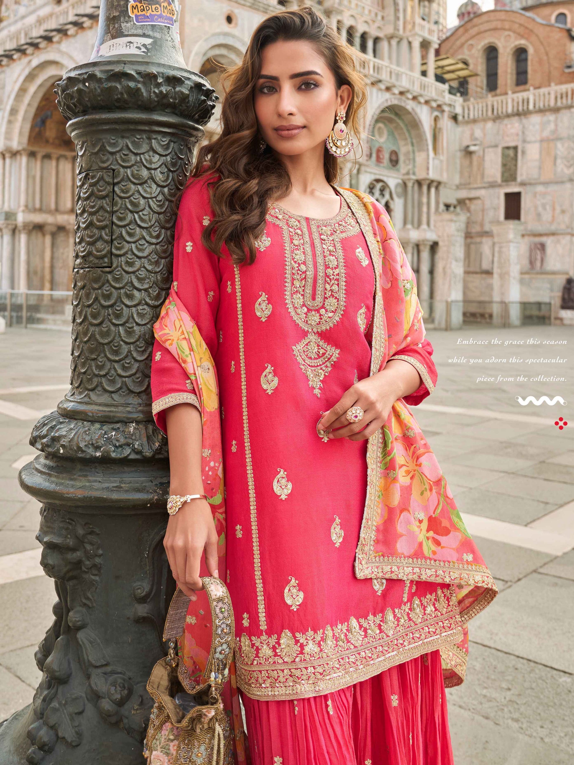 This rose pink Sharara set showcases exquisite craftsmanship with its premium Real Simar Silk, featuring intricate embroidery that enhances the topβs elegant appeal. Complemented by a flared viscose jacquard sharara, the ensemble offers a sophisticated silhouette with comfortable movement. The digitally printed floral Chinon dupatta adds a delicate, vibrant touch, making this set perfect for weddings, mehendi, and festive celebrations where refined style and festive grace meet seamlessly.