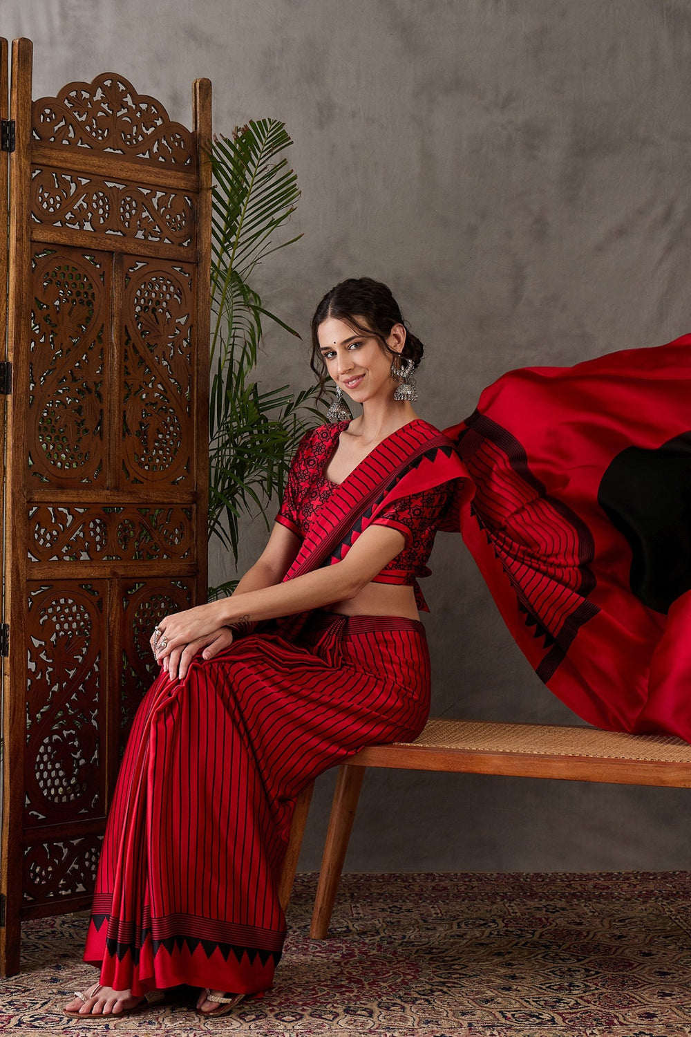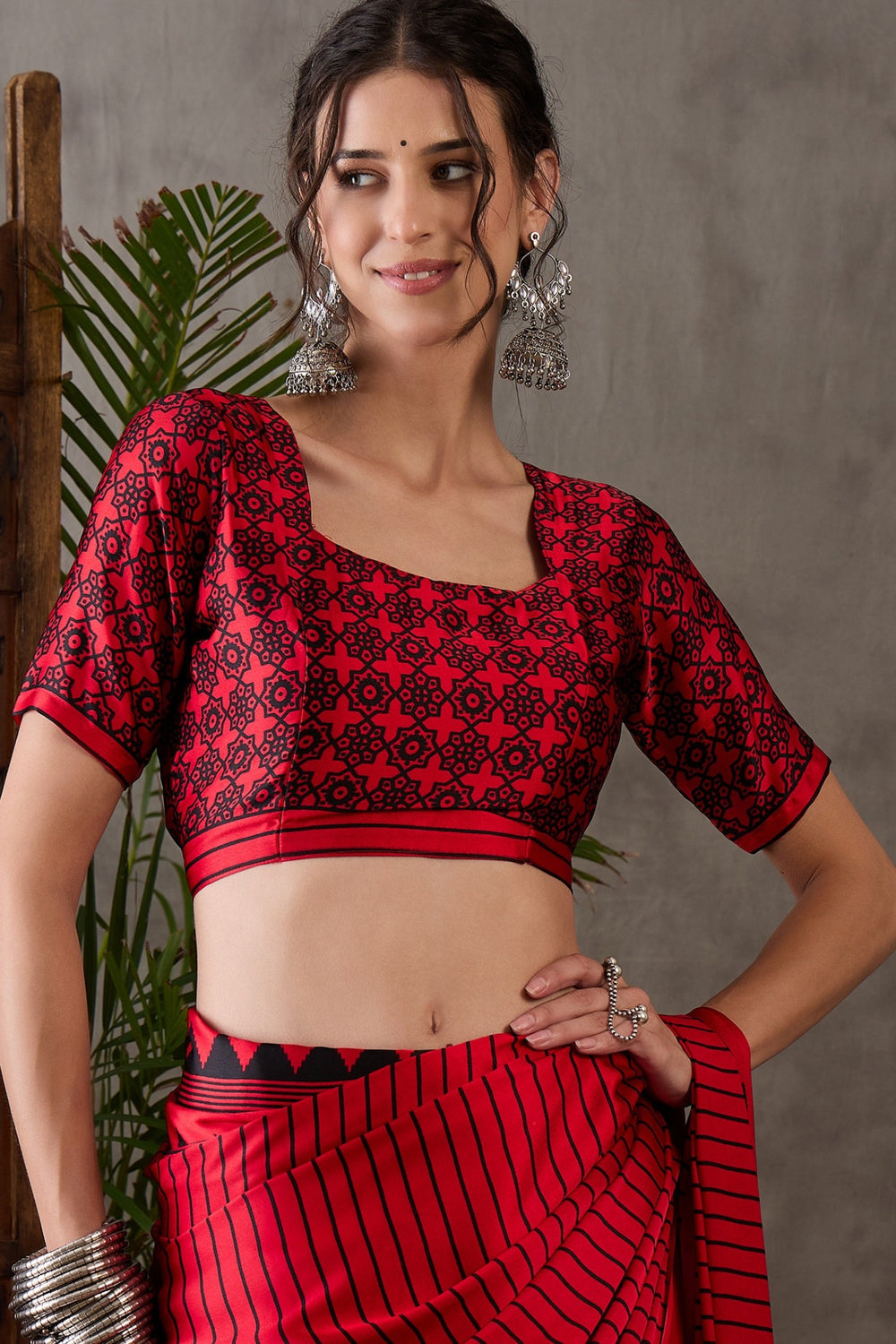 Rose Red Printed Satin Gaji Silk Saree