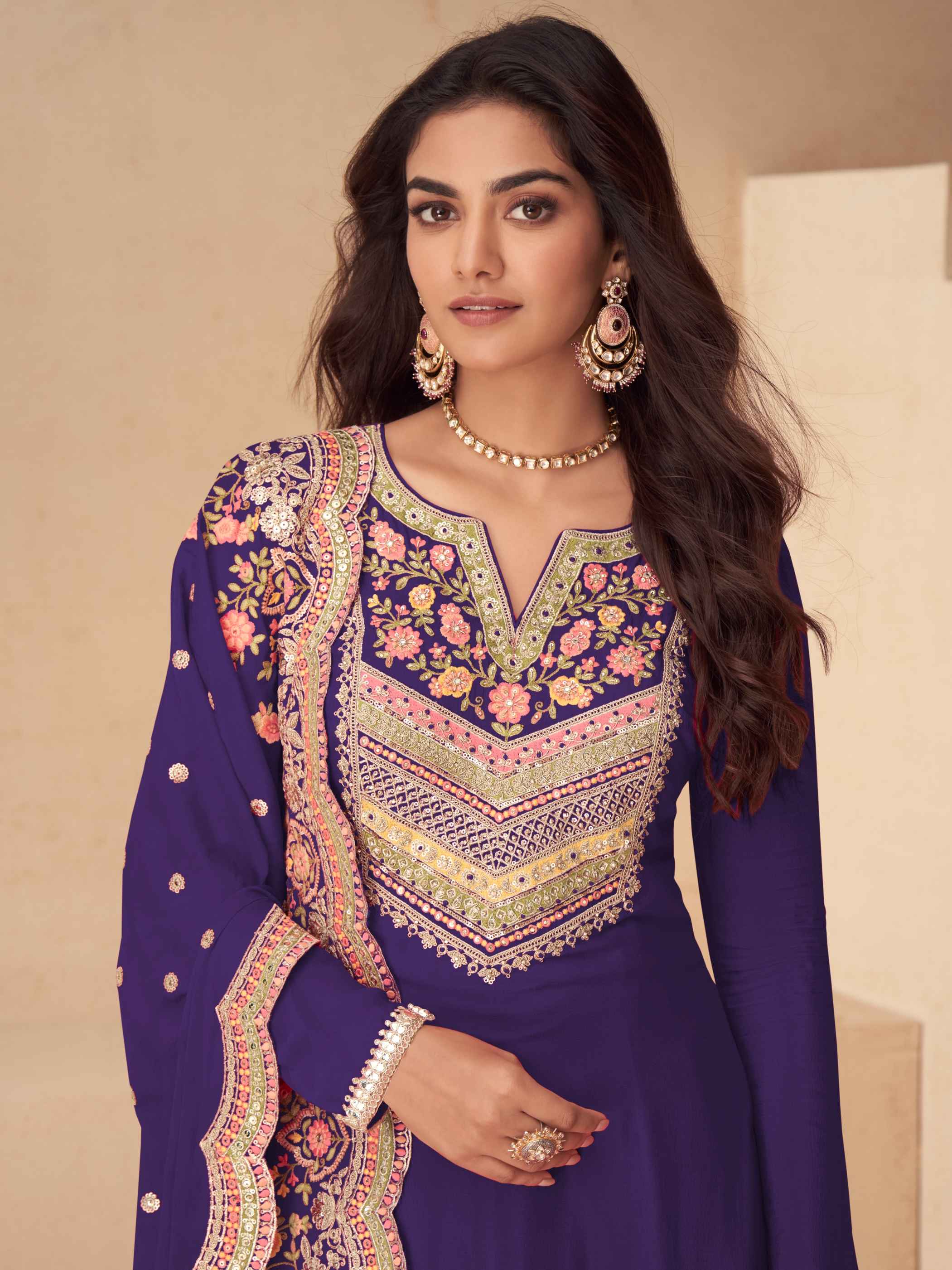 Royal Purple Chinon Embroidered Kurta Palazzo Set with Dupatta