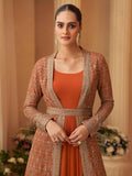 Rust Designer Embroidered Long Jacket Gown Set This sophisticated ensemble combines timeless elegance with contemporary design sensibilities. The rust-toned jacket features intricate hand-inspired embroidery that gracefully defines the silhouette, while the premium chinon silk fabric drapes with a luxurious softness. Ideal for mehendi ceremonies, daytime celebrations, and intimate family gatherings, this set delivers refined traditional aesthetics without compromising on comfort. The carefully curated color palette and detailed craftsmanship make it a versatile addition to your festive wardrobe, suitable for both formal occasions and semi-formal events.