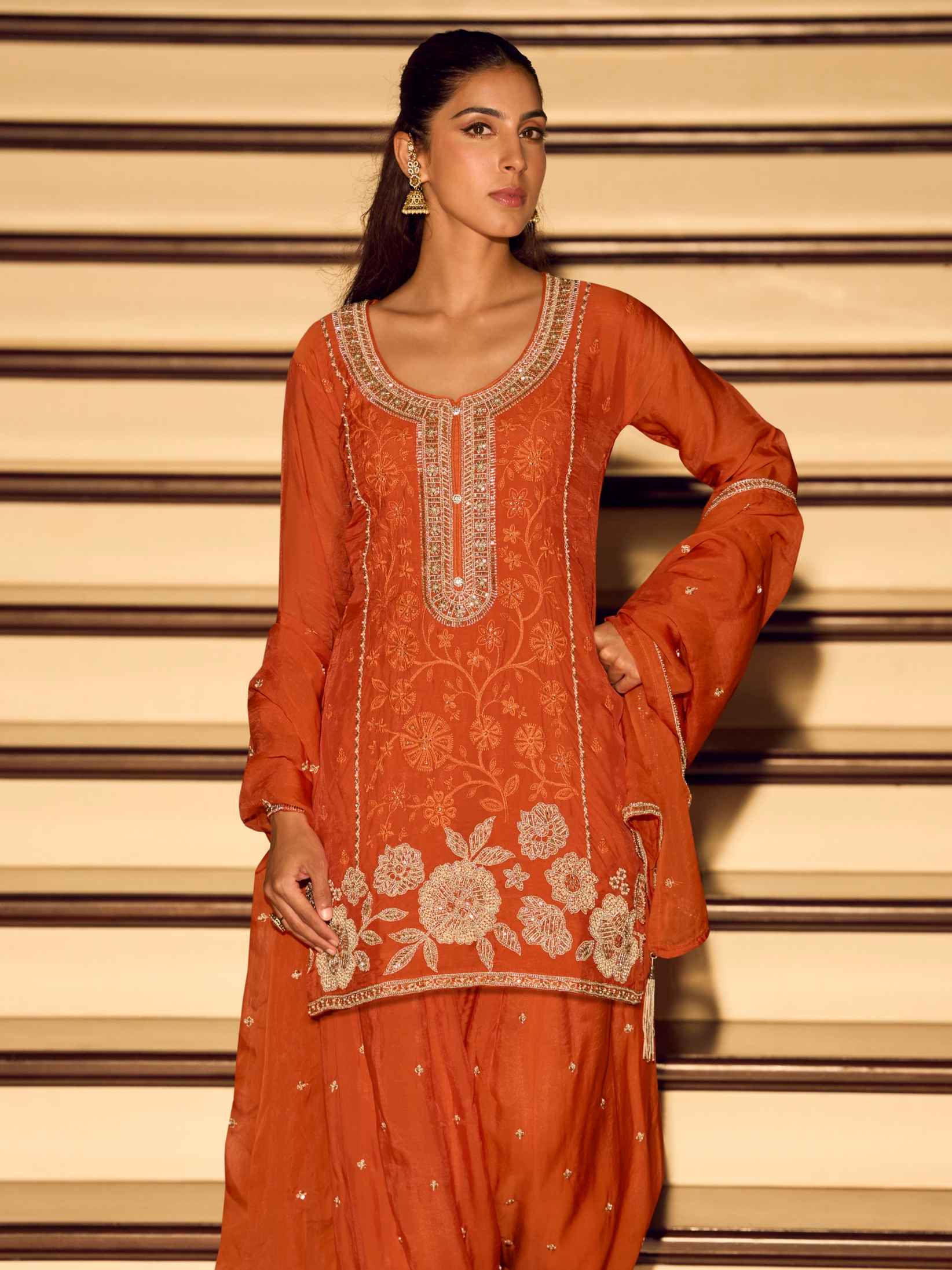 Rust Orange Chinon Silk Beads Embroidered Sharara Suit
