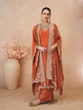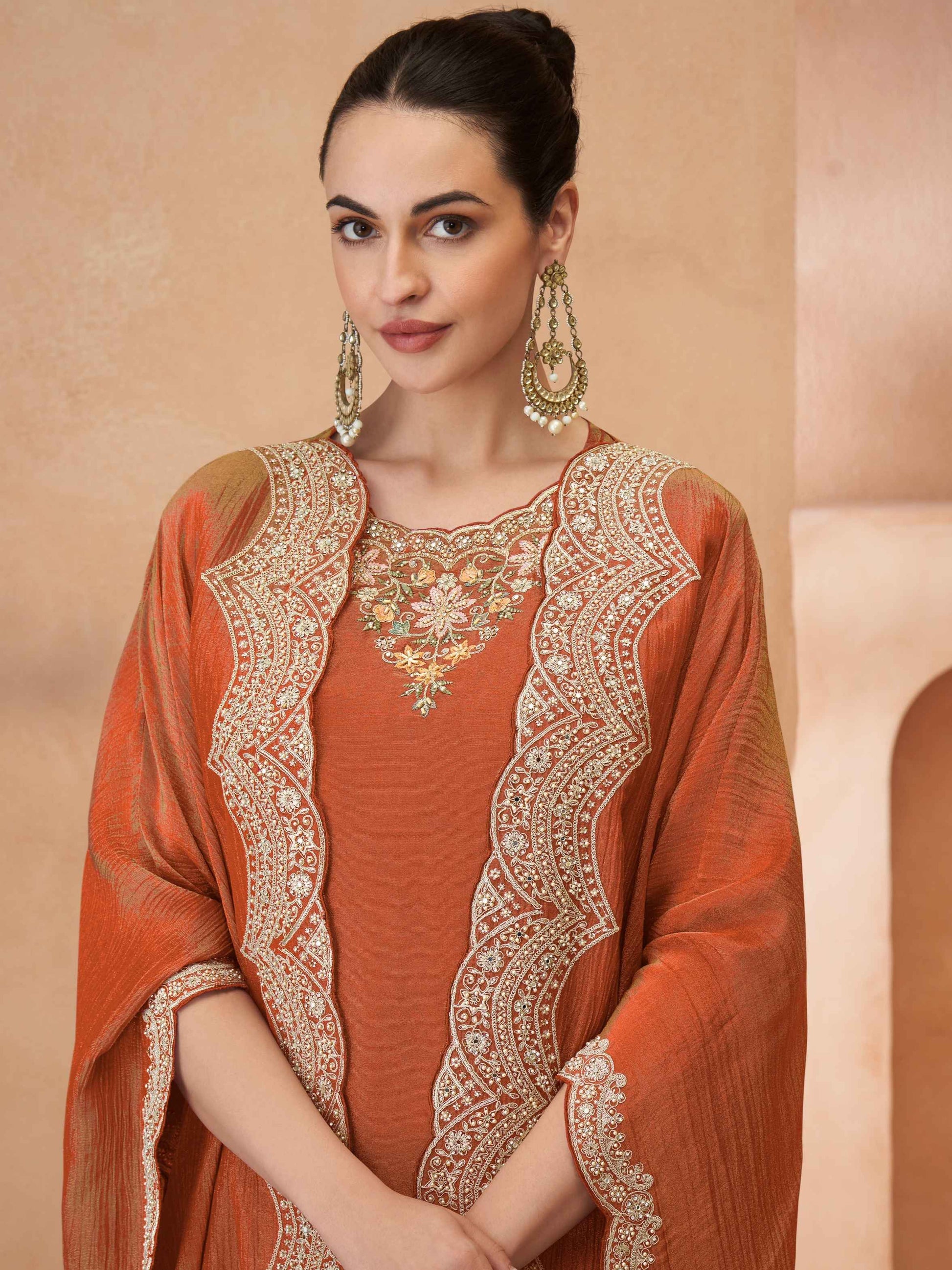 Rust Orange Embroidered Simar Silk Palazzo Suit with Dupatta