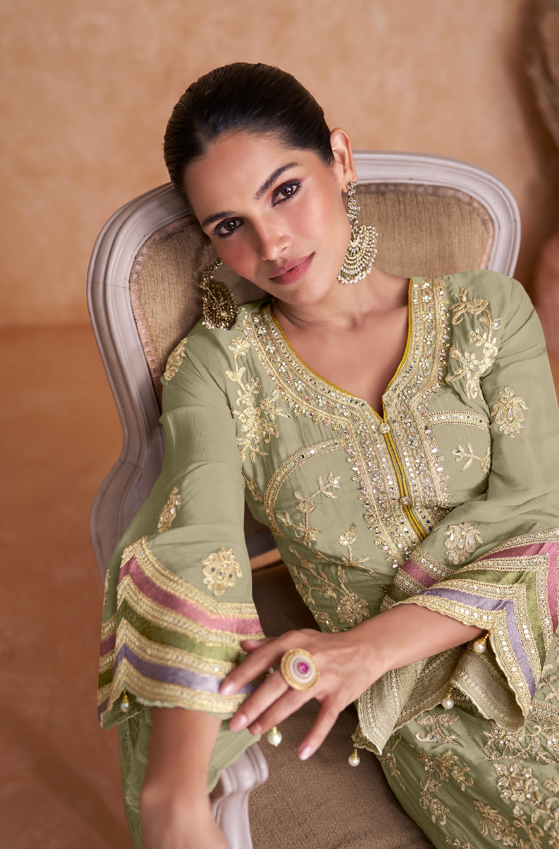 Sage Green Real Chinon Palazzo Suit with Embroidered Dupatta