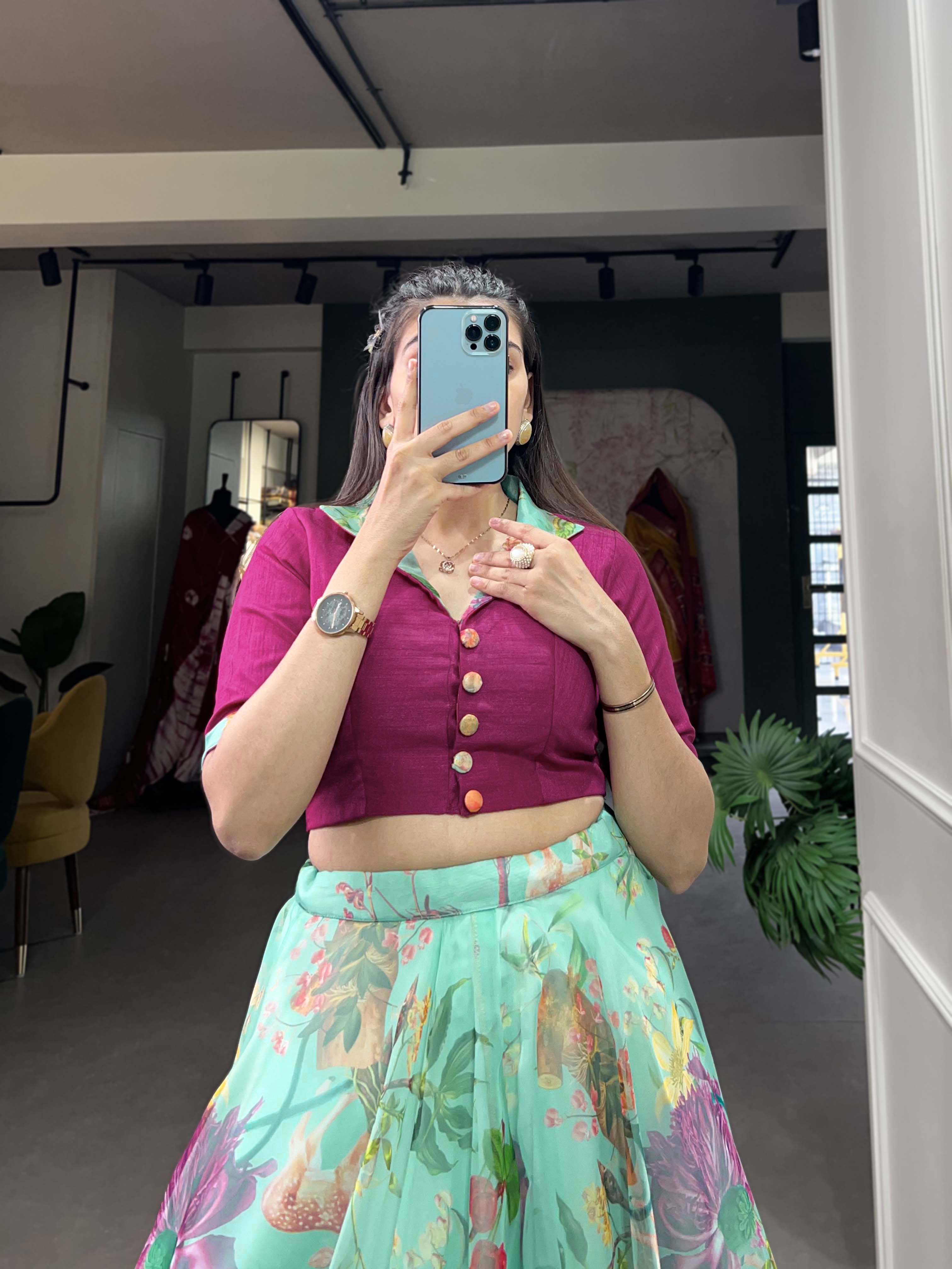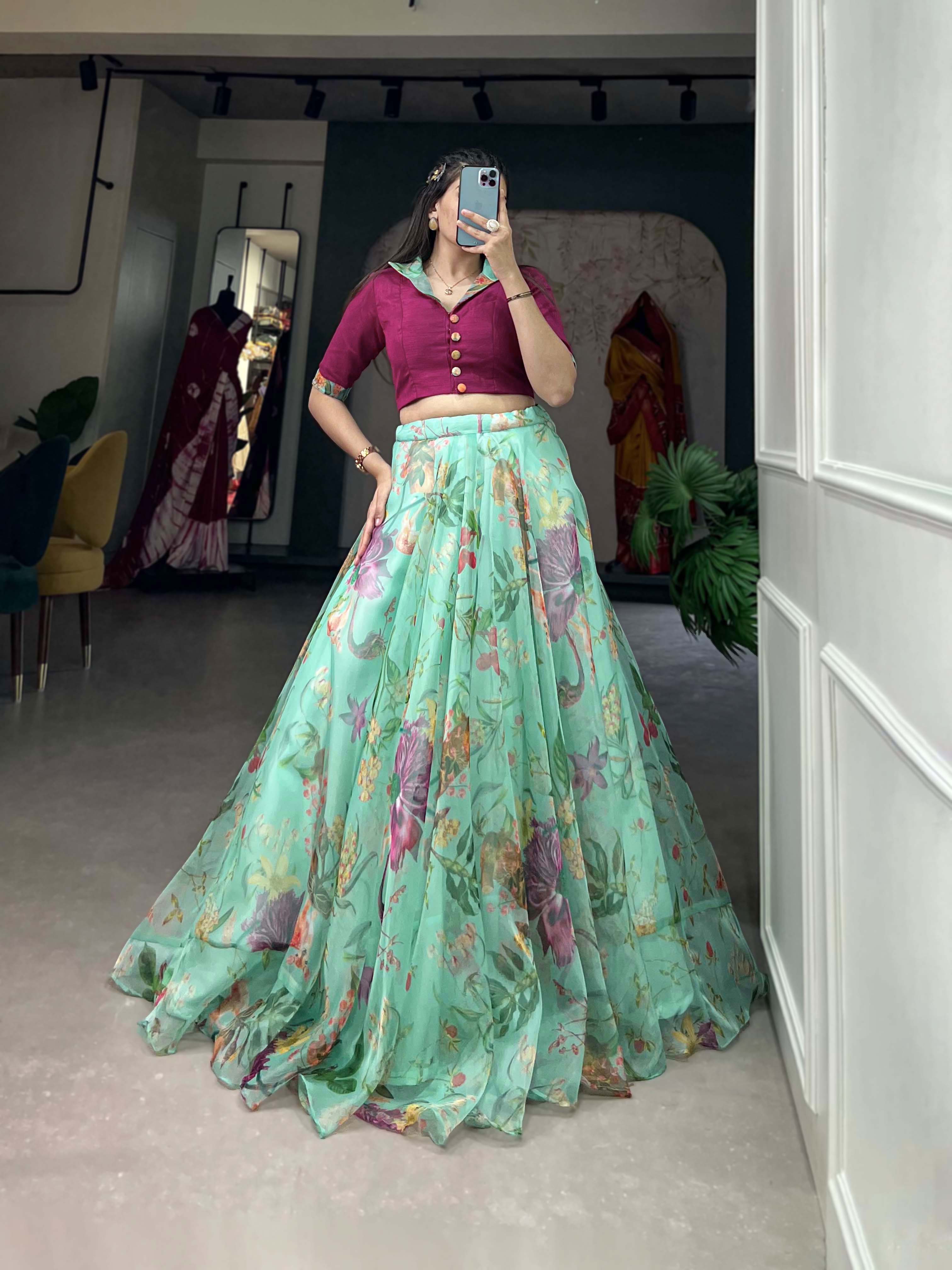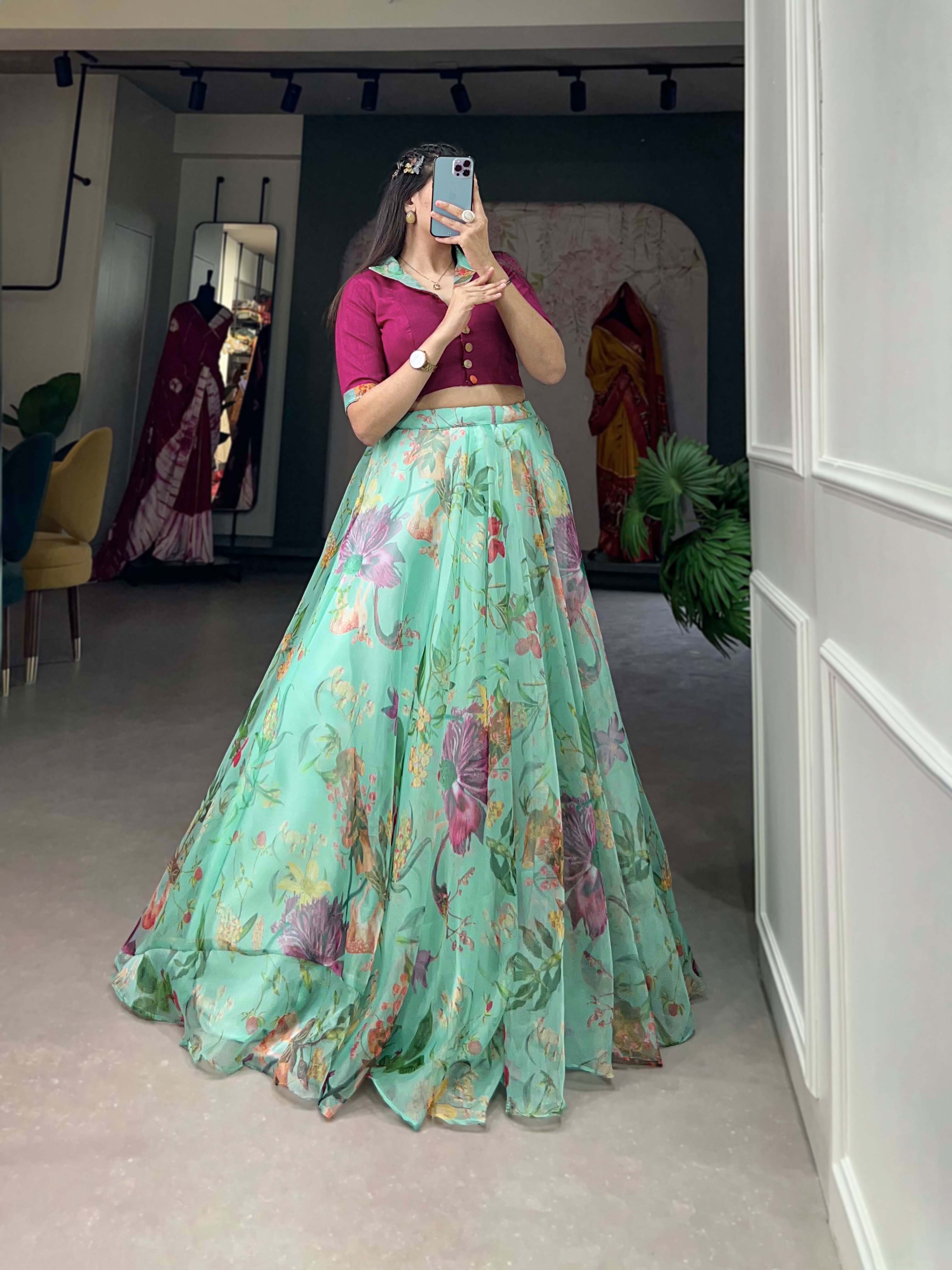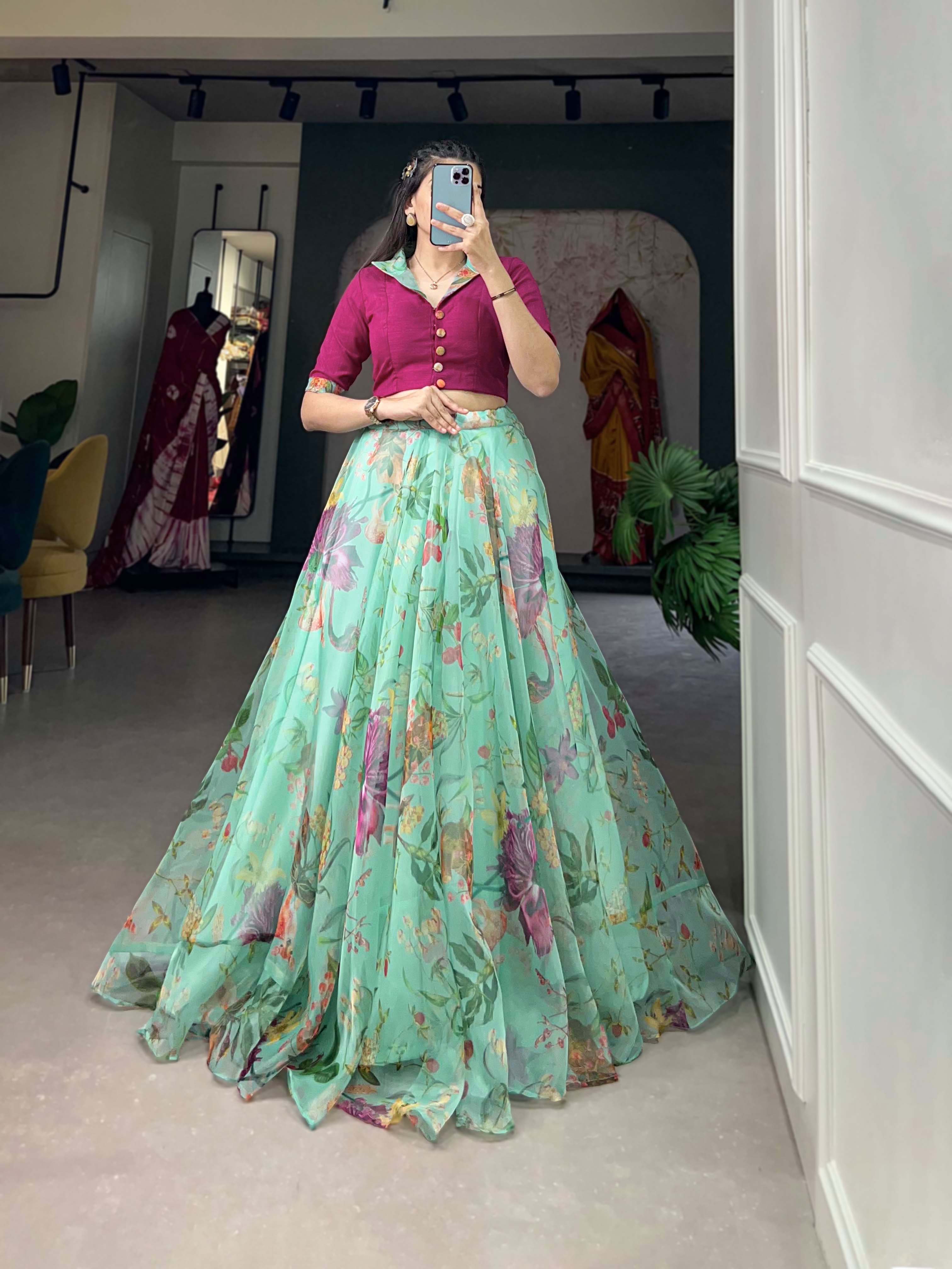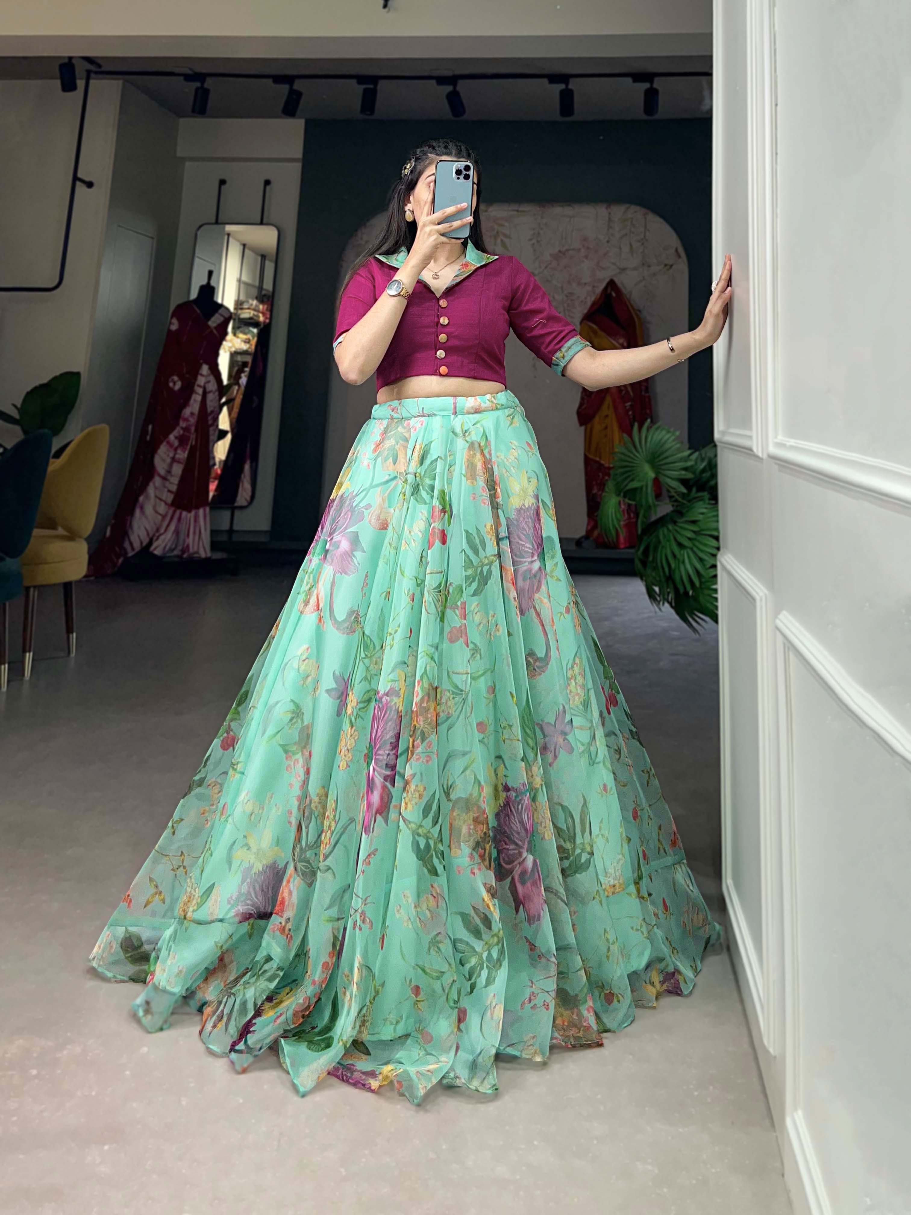 Sea Green Pure Organza Silk Long Floral Print Readymade Gown