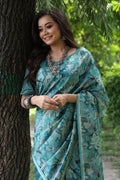 Soft desi Tussar silk saree with unique hand type printed pattern with tiny zari weaving border and printed pallu with traditional tassels and running blouse piece