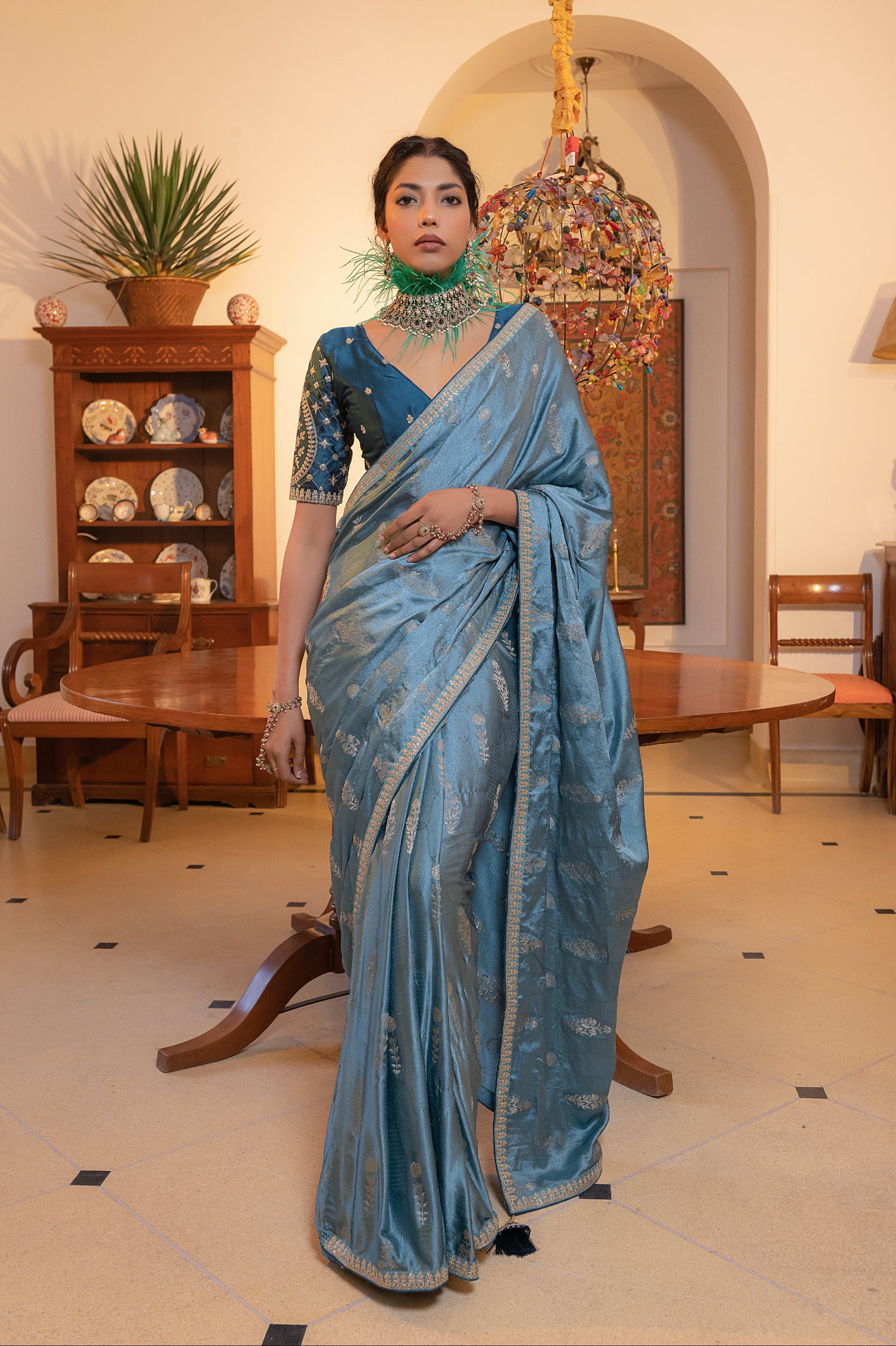 Sky Blue Viscose Satin Silk Saree with Zari Motifs and Sequin Embroidery